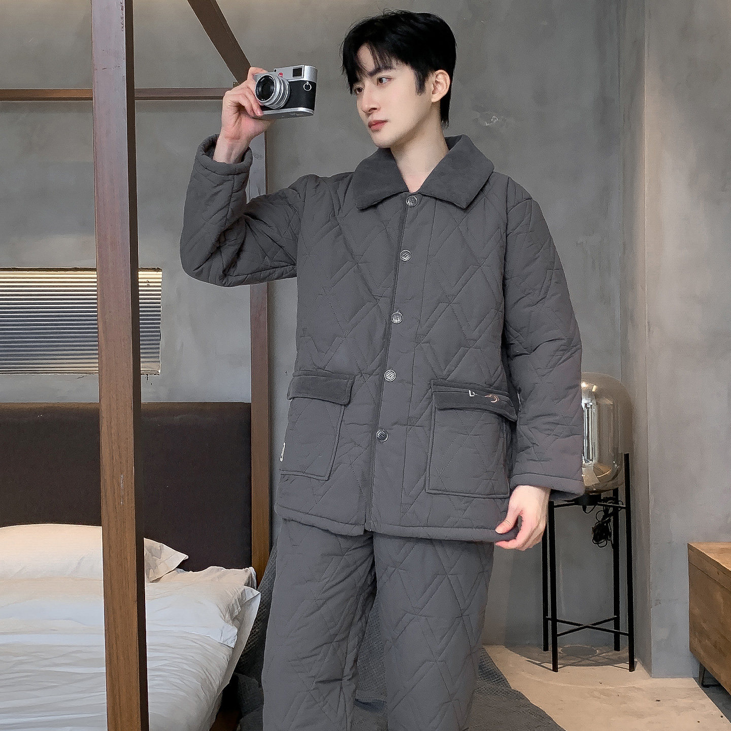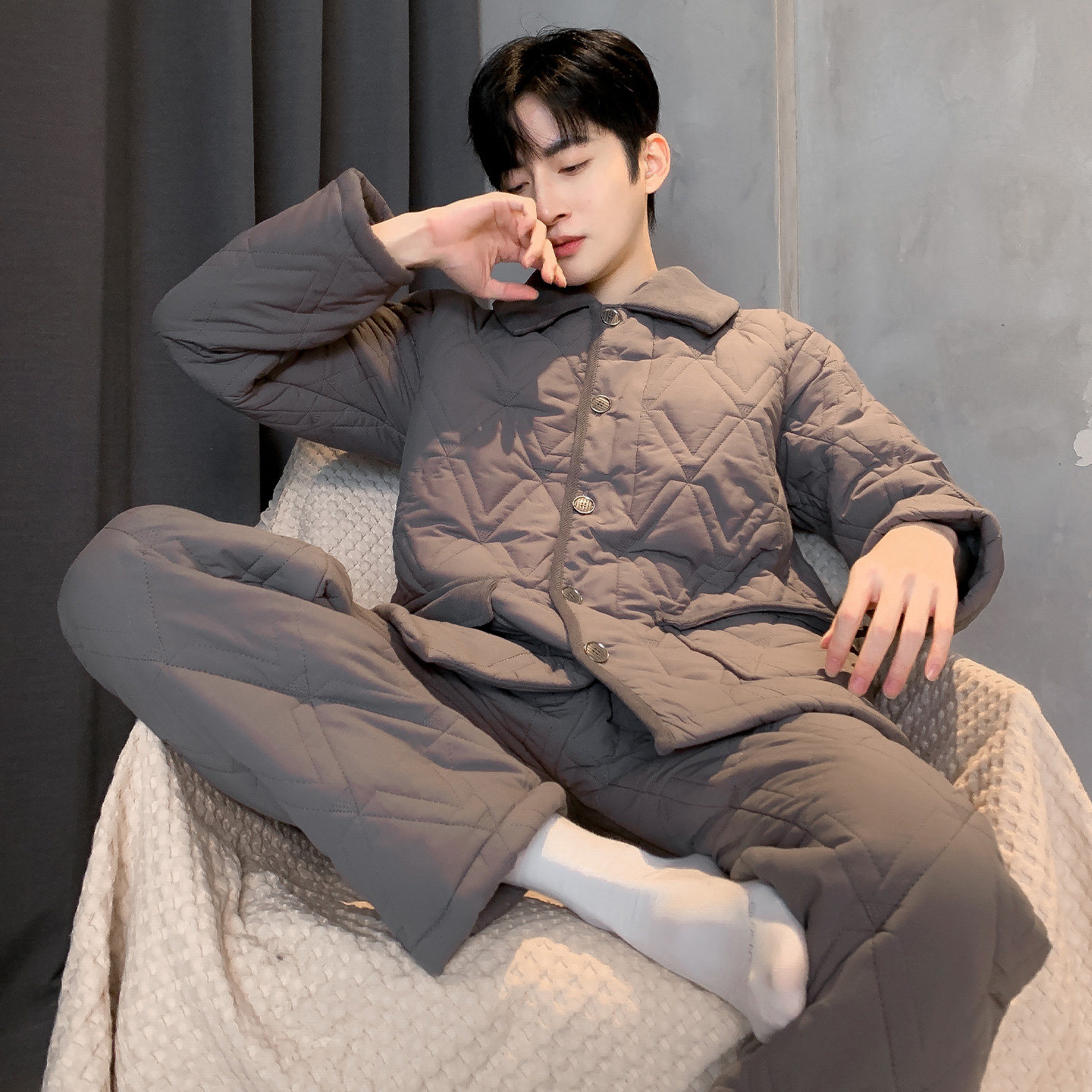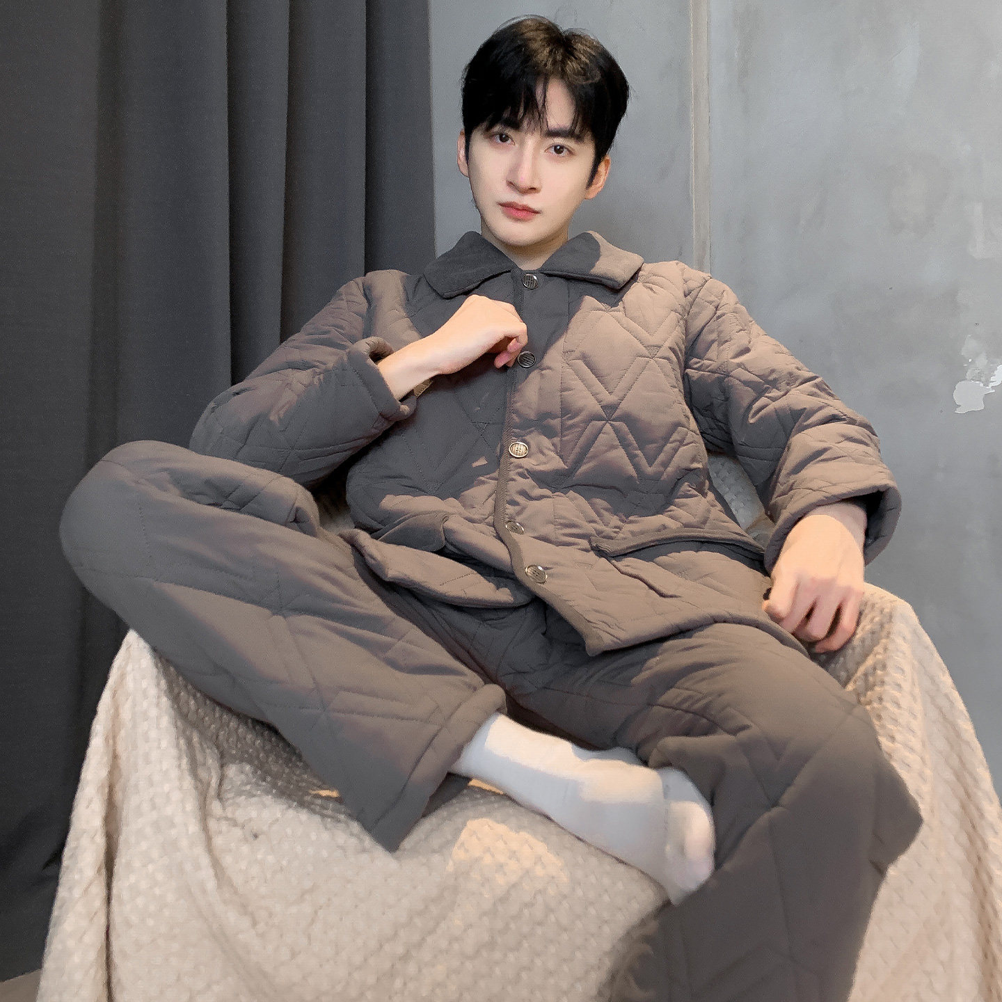 猫人睡衣男士冬季三层加厚夹棉袄加绒纯棉冬款保暖大码家居服套装