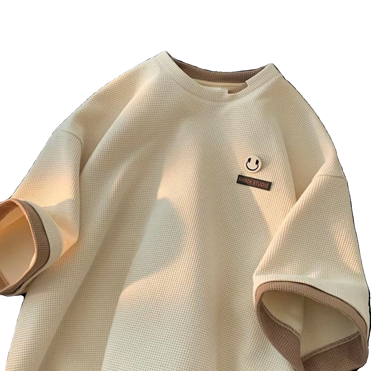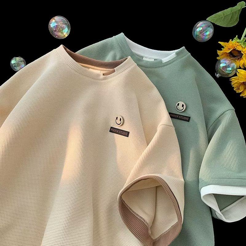 美式复古华夫格短袖男夏季潮牌假两件t恤潮流学生宽松半袖上衣服