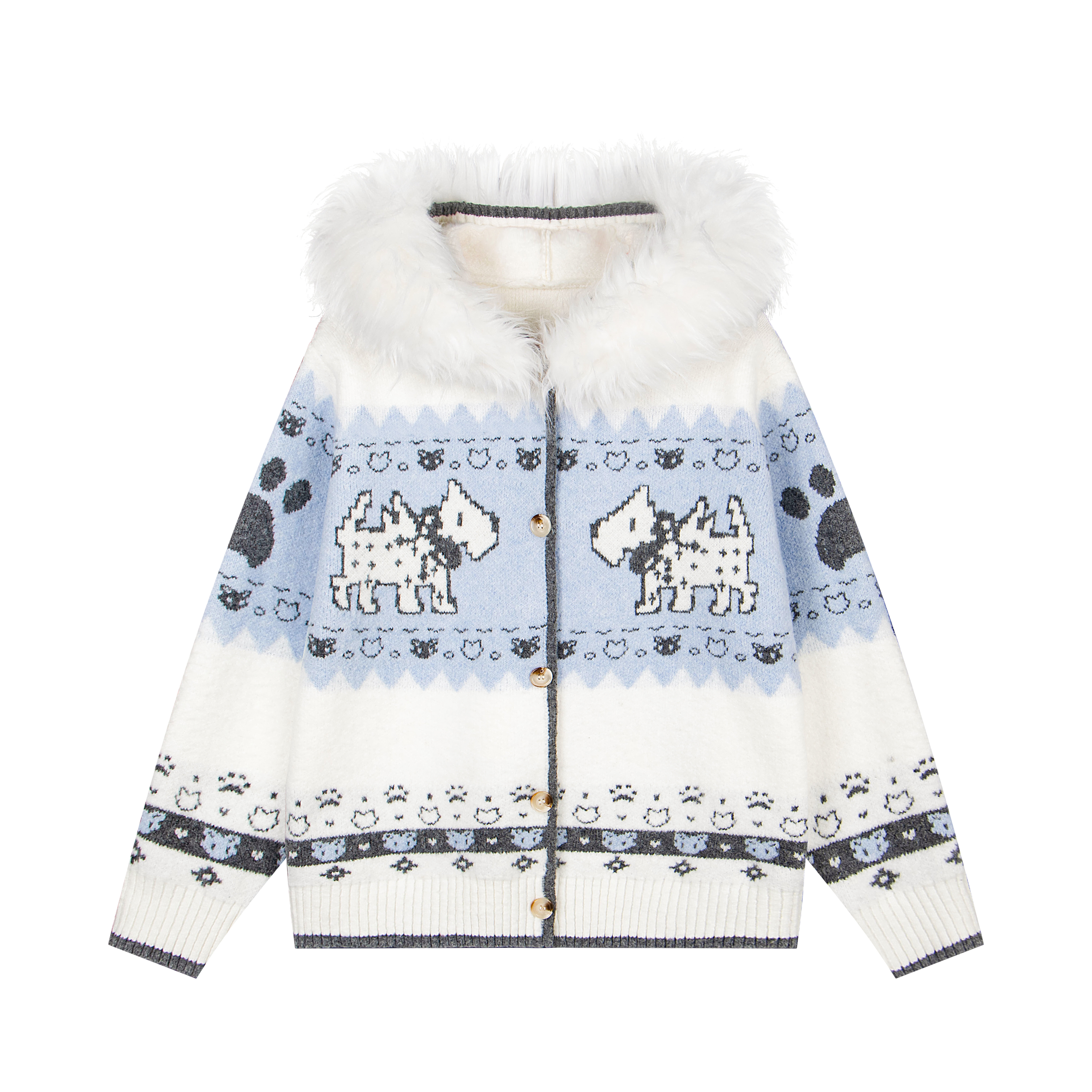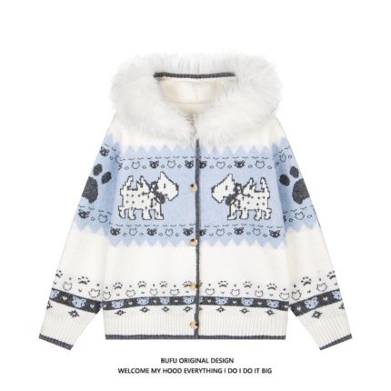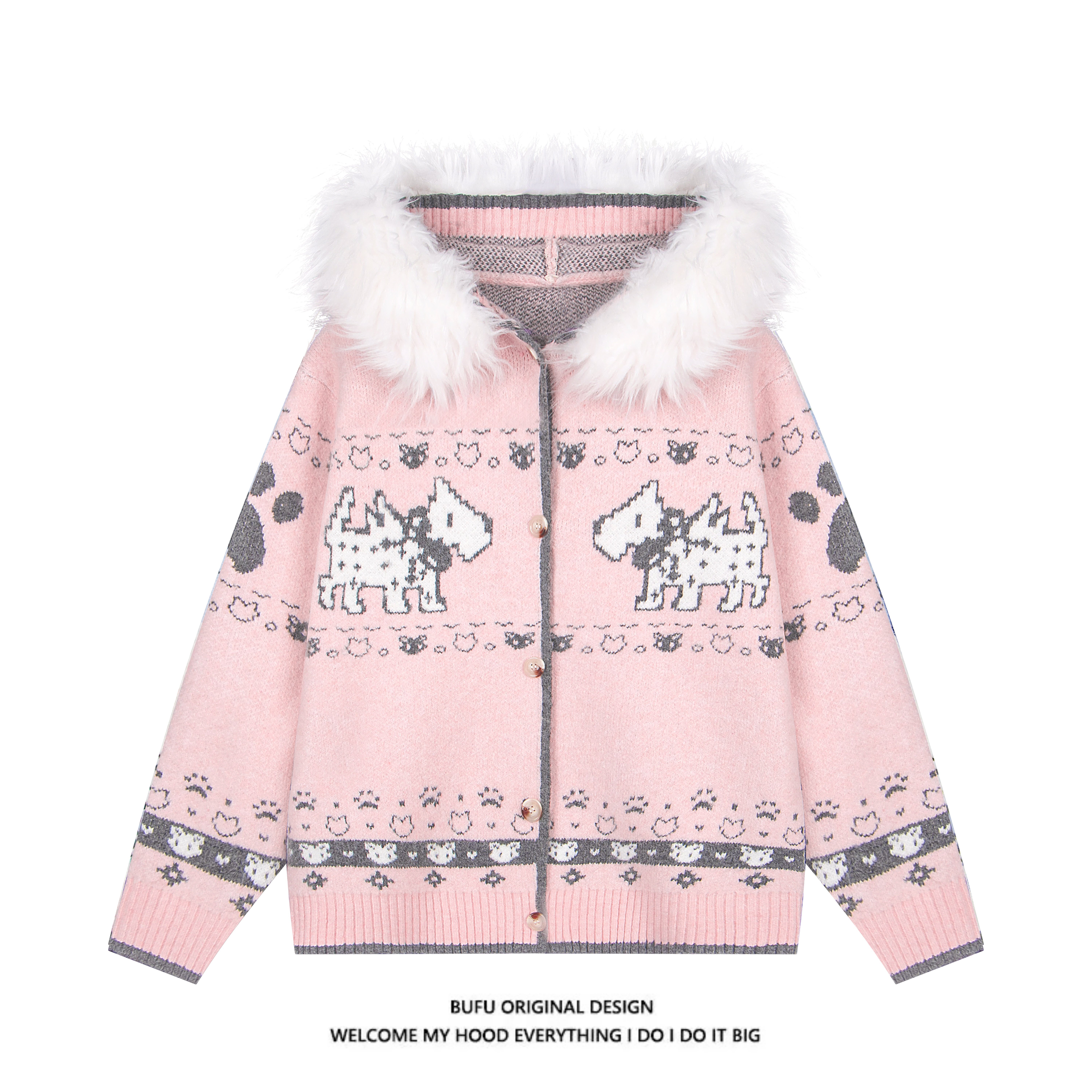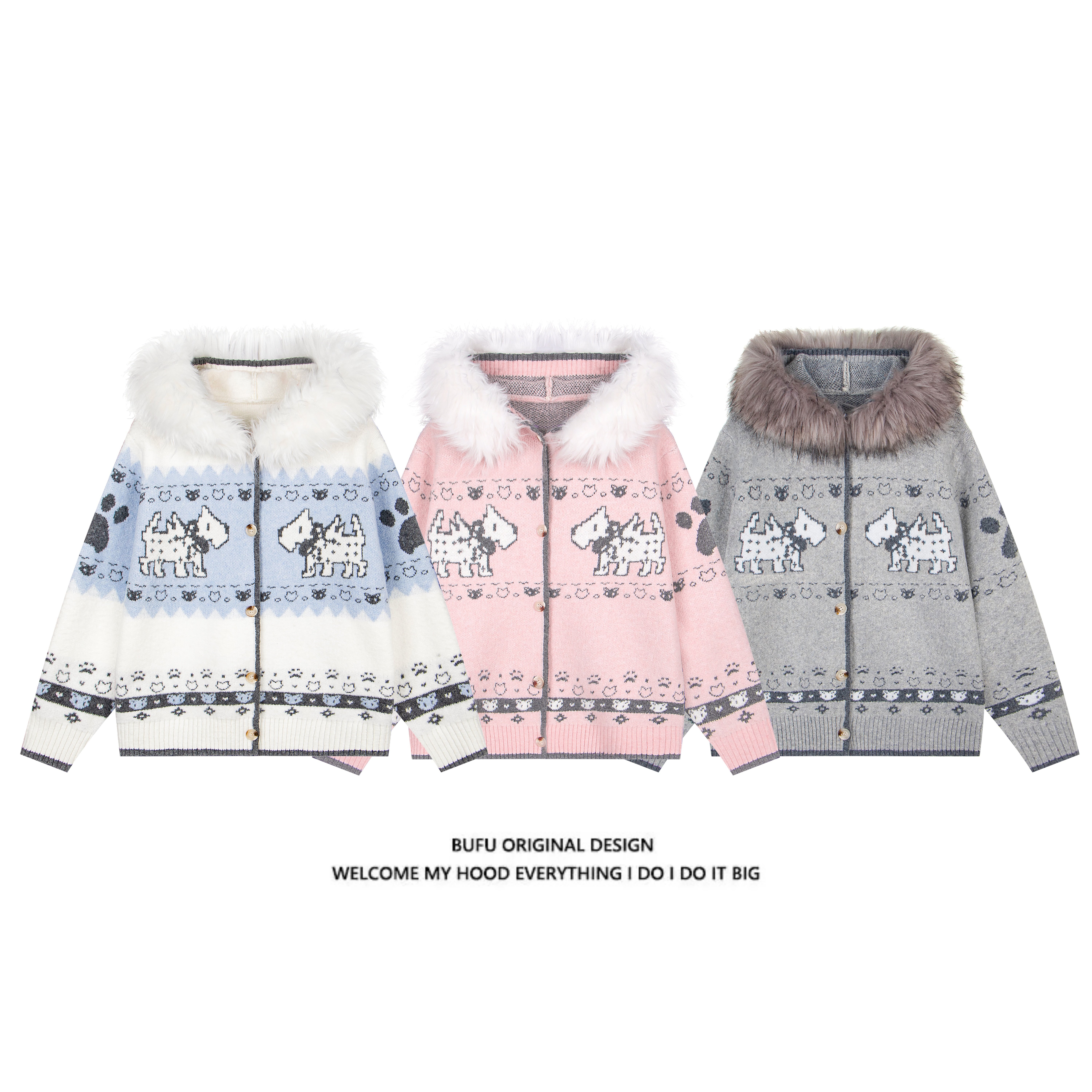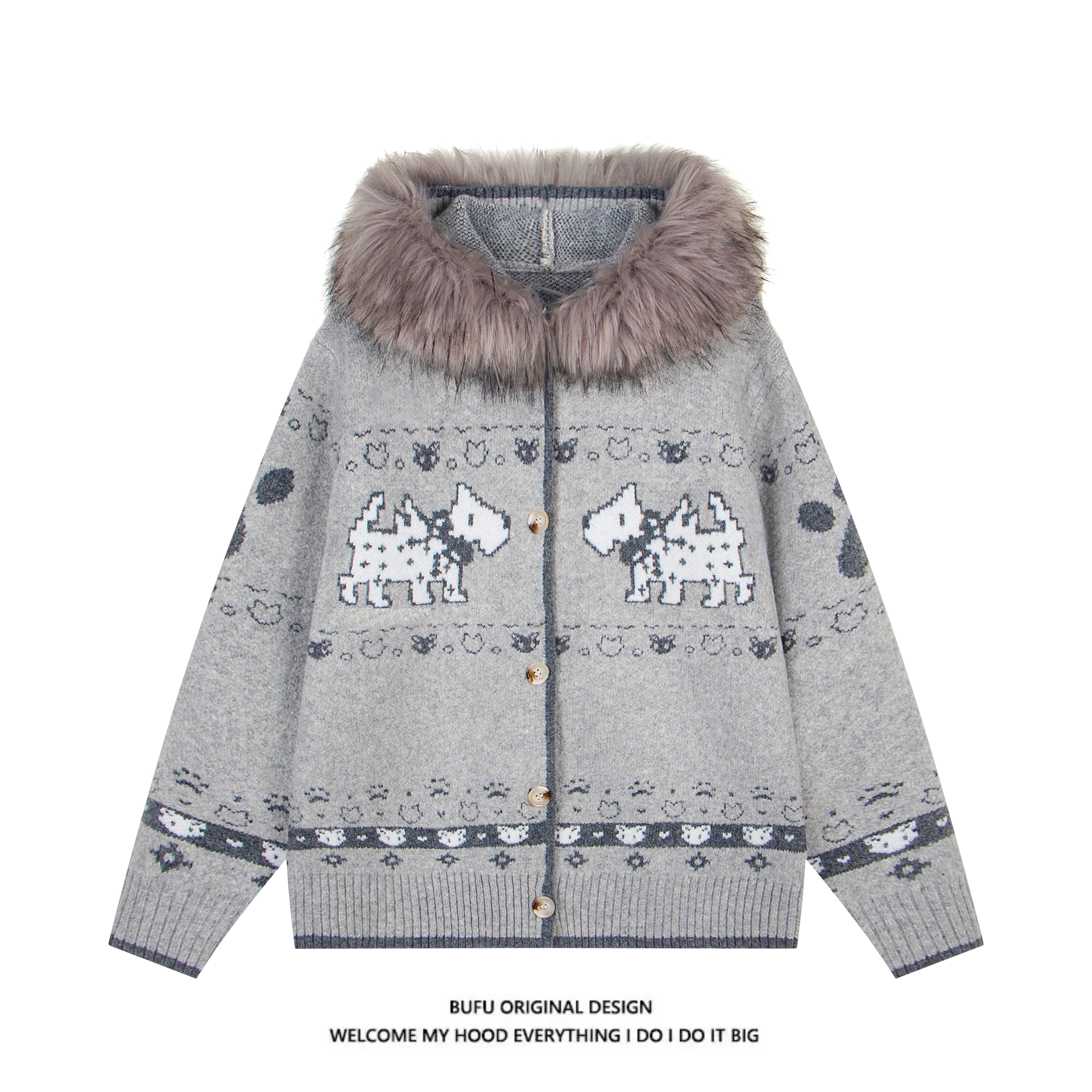 亿万少年BUFU原创美式复古毛领提花连帽针织开衫弗尔岛小狗毛衣女