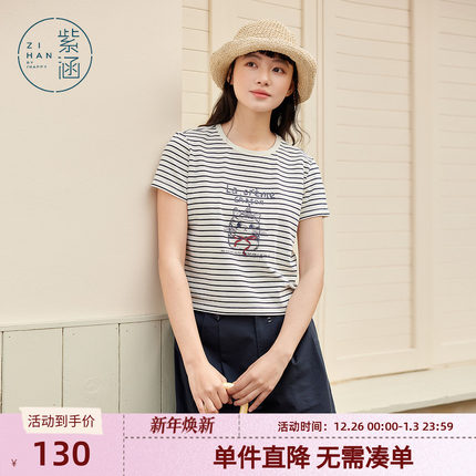 紫涵猫咪印花条纹圆领正肩T恤女2025年夏季新款百搭休闲短袖上衣