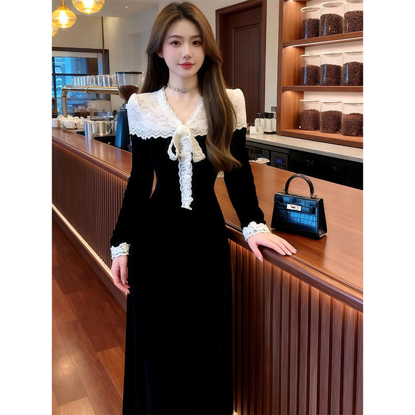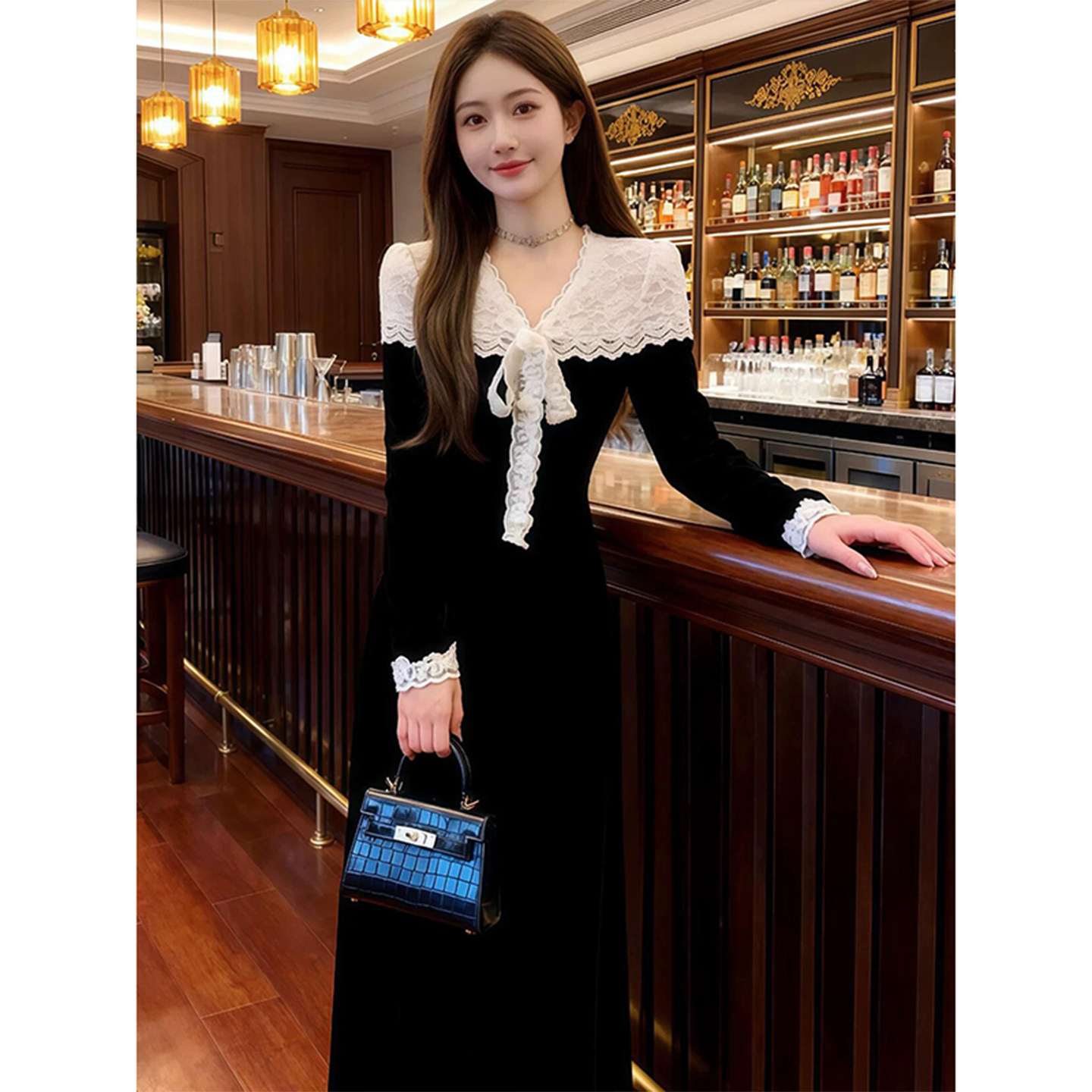 大码女装法式赫本风蕾丝拼接连衣裙女秋冬高级感长袖气质丝绒长裙