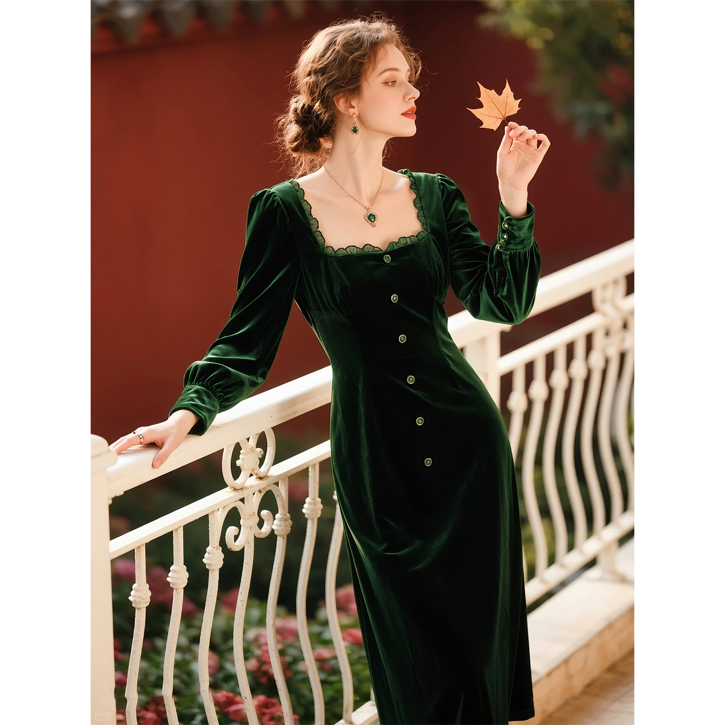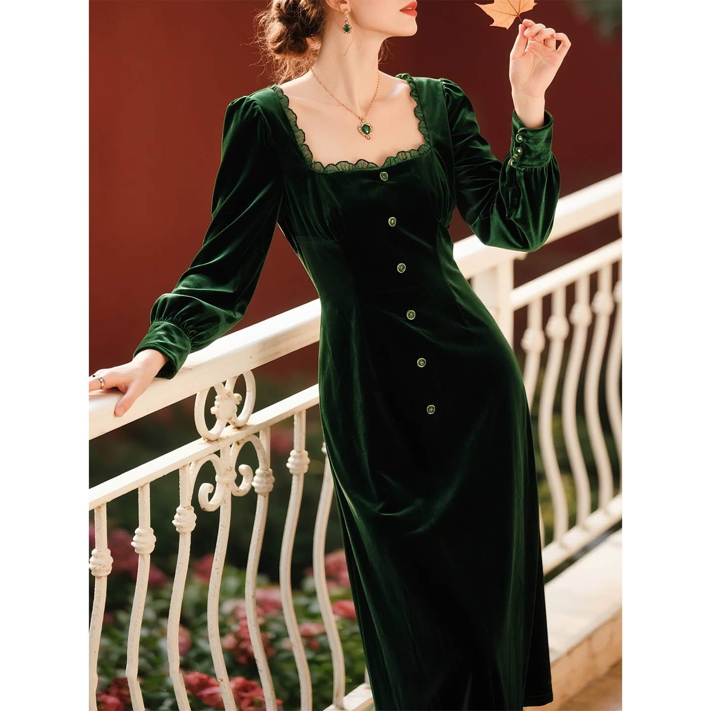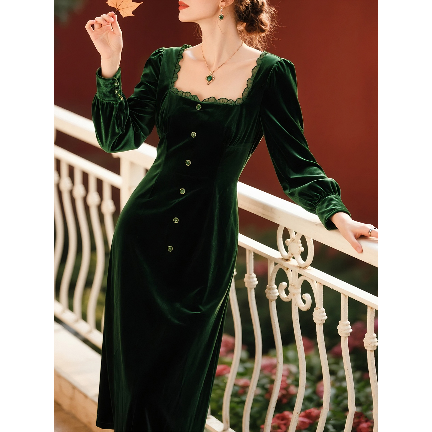 墨绿色丝绒方领连衣裙女2025秋冬新款轻奢优雅风收腰显瘦气质裙