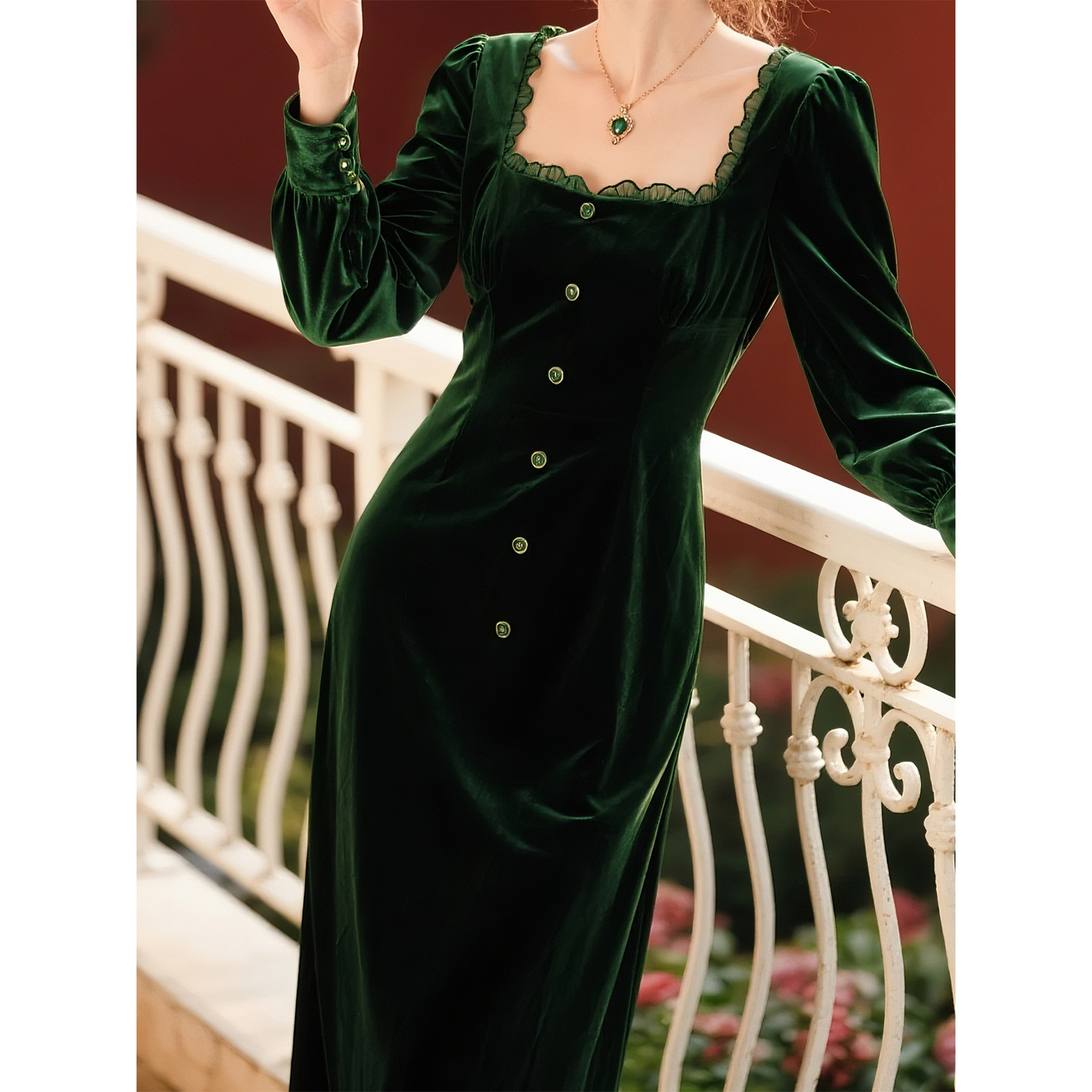 墨绿色丝绒方领连衣裙女2025秋季