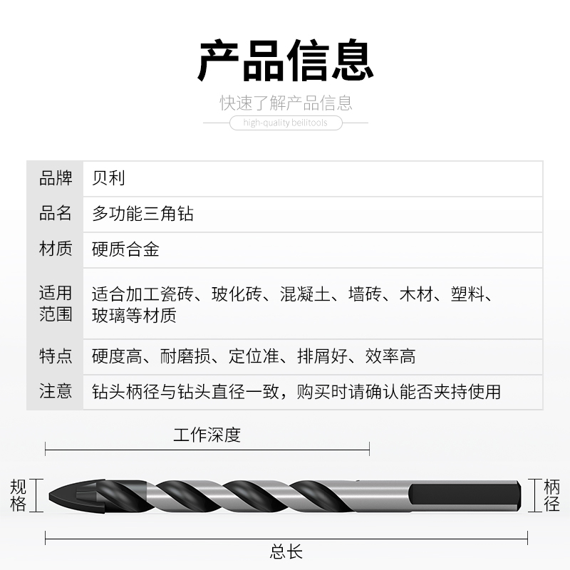 贝利陶瓷玻璃瓷砖转头水泥墙壁开孔器钻头合金多功能麻花三角钻头