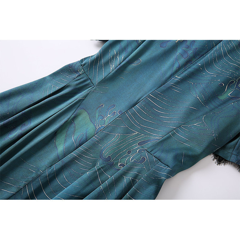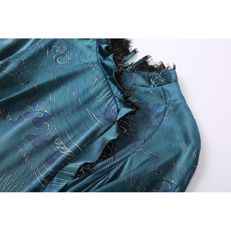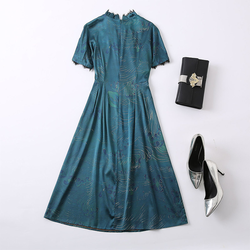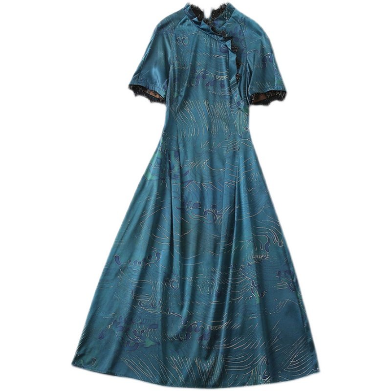 夏100%桑蚕丝香云纱提花连衣裙女连肩袖斜开领拼接蕾丝古典风旗袍