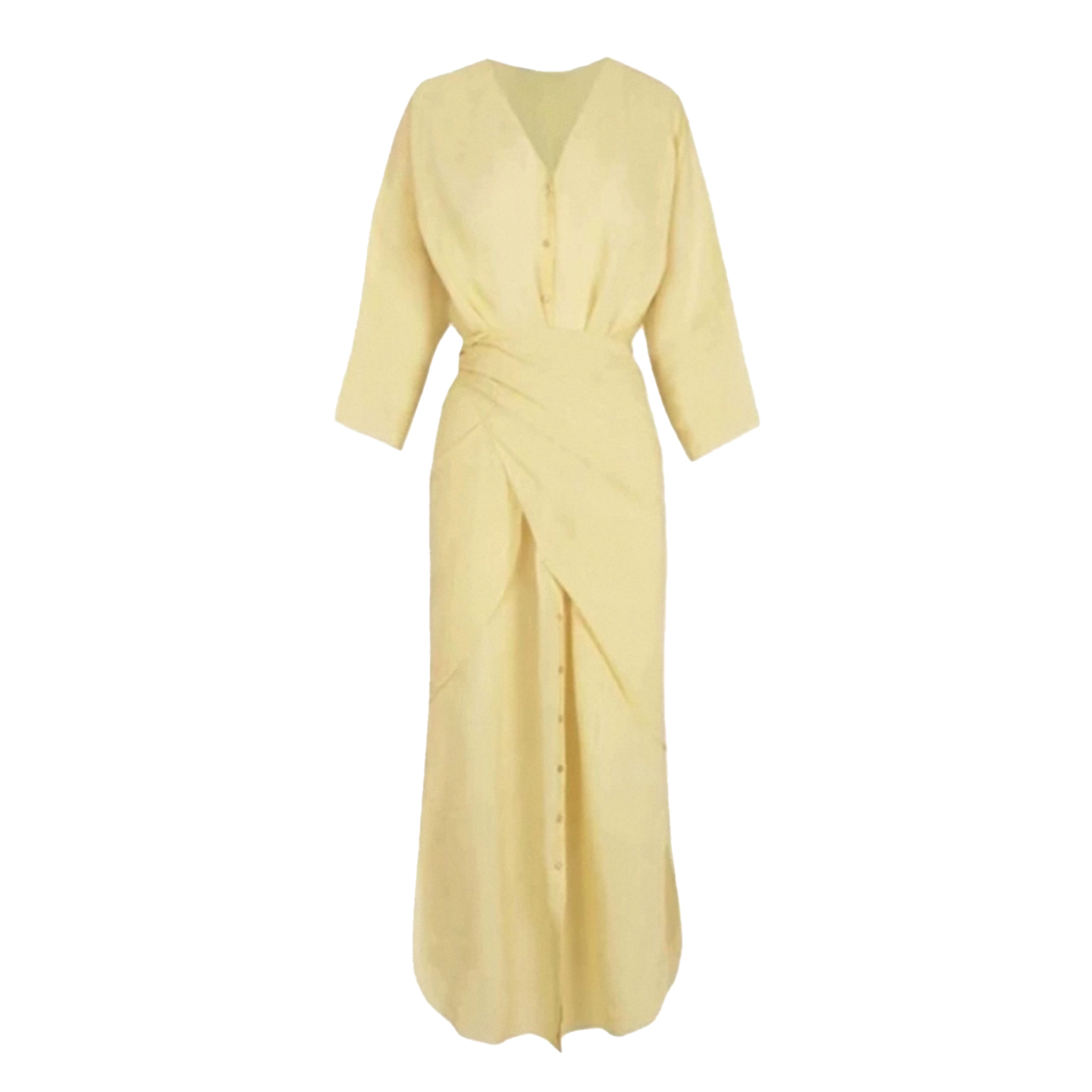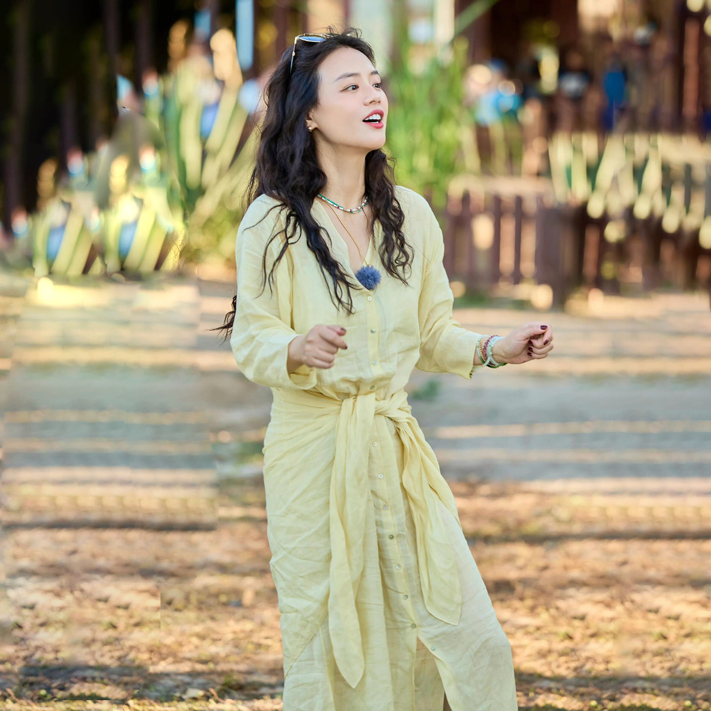 马思纯花少同款棉麻黄色法式V领连衣裙女设计感收腰显瘦气质长裙