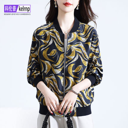 妈妈印花棒球服桑蚕丝绸夹克开衫