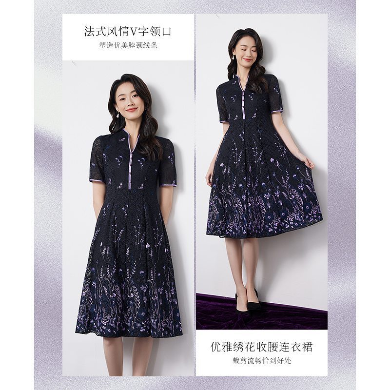 黛玛诗2025秋季新款优雅时尚绣花收腰连衣裙浪漫减龄短袖蕾丝裙女