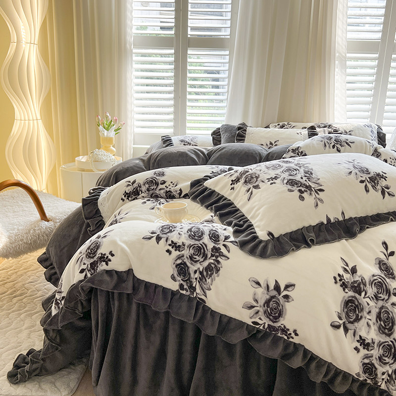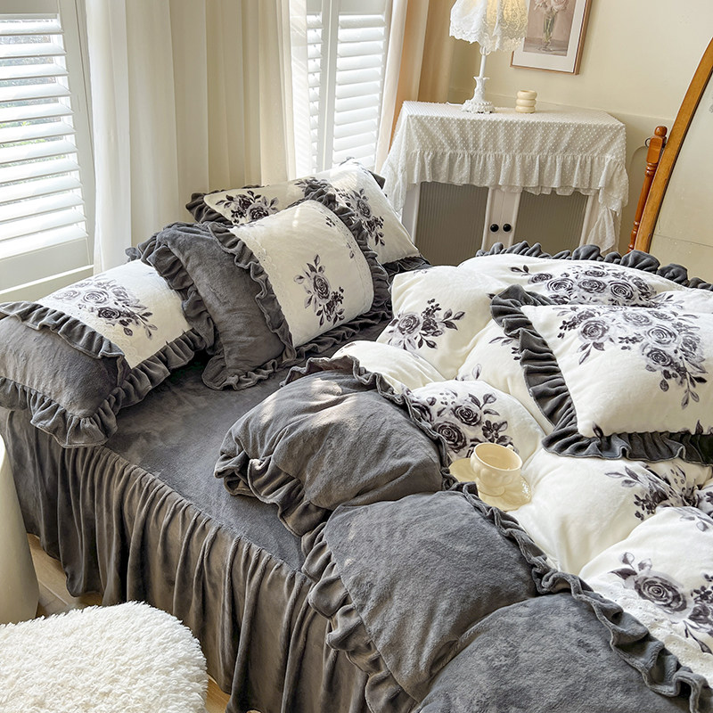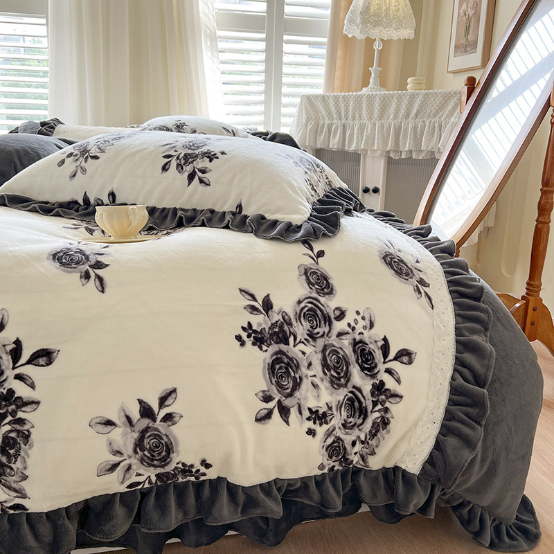 法式复古冬季加绒加厚牛奶绒四件套公主风花边被套毛绒珊瑚绒床裙