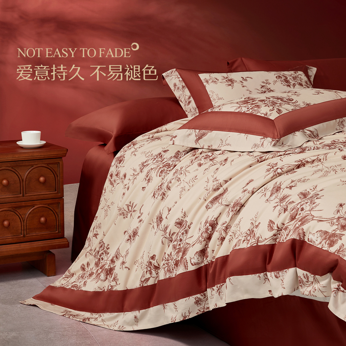 水星家纺全棉婚庆四件套60支长绒棉喜庆红色结婚新中式婚嫁床上品