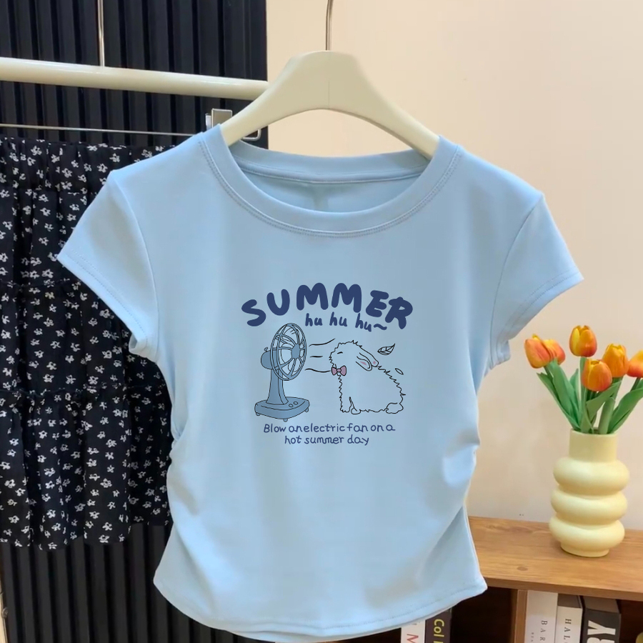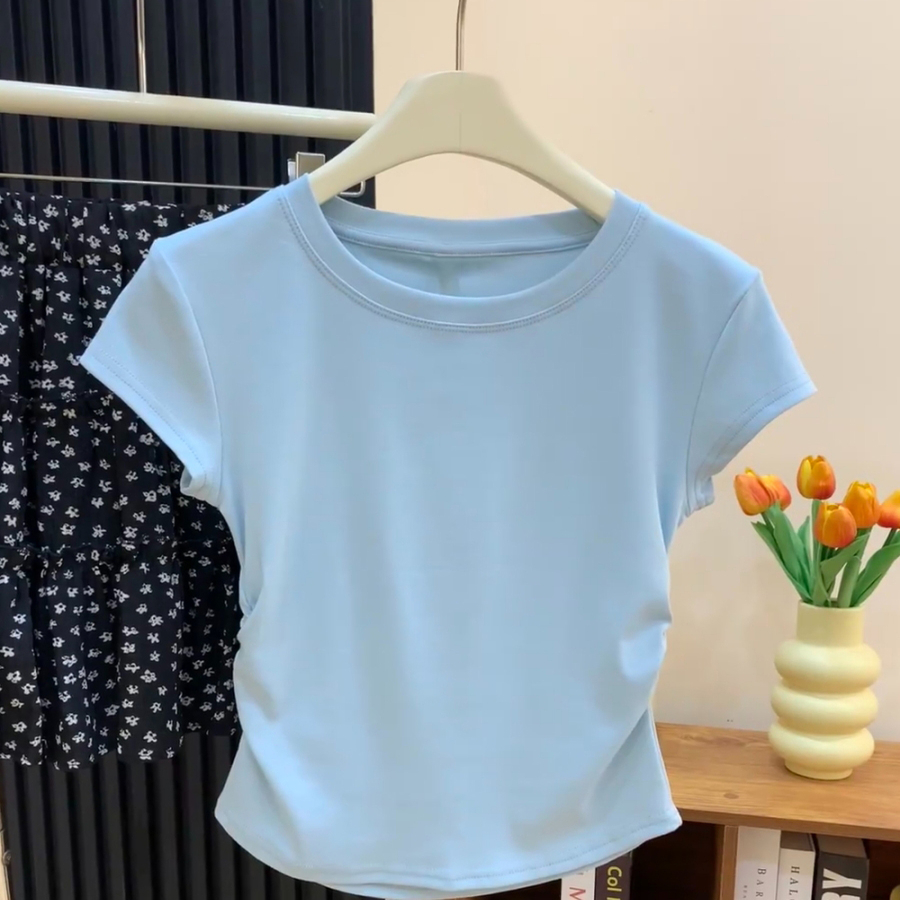 蓝色多巴胺纯棉短袖T恤2025夏季新款清纯系掐腰小众设计感上衣女