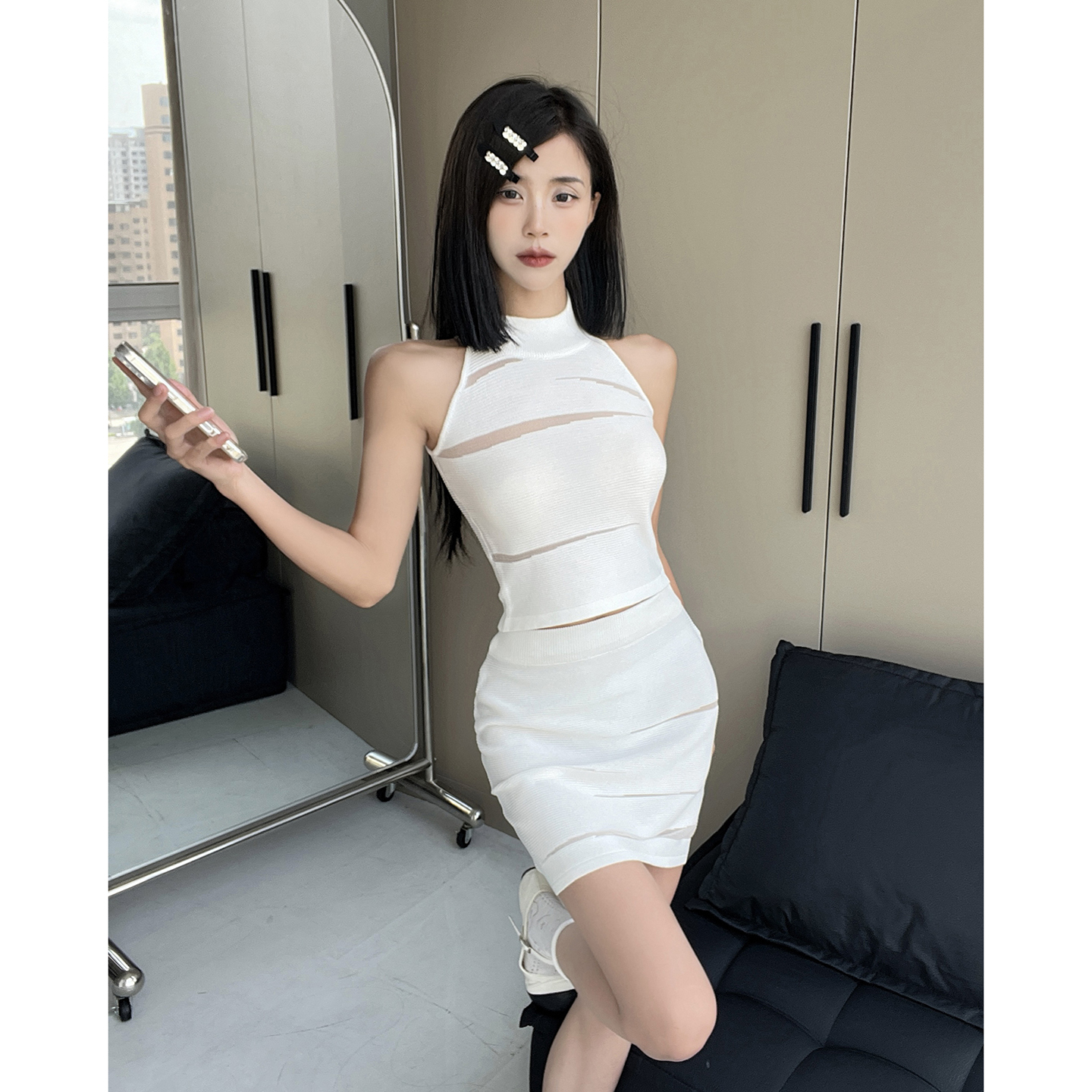 纯欲风针织镂空无袖挂脖高领背心女高腰修身包臀短裙性感气质套装