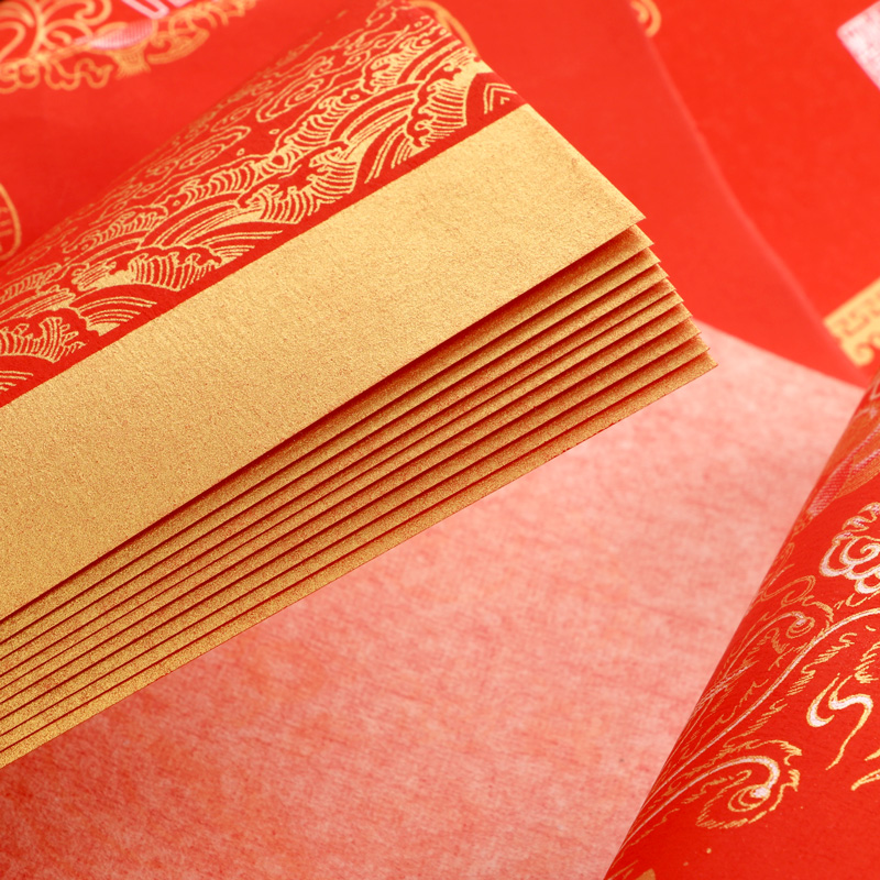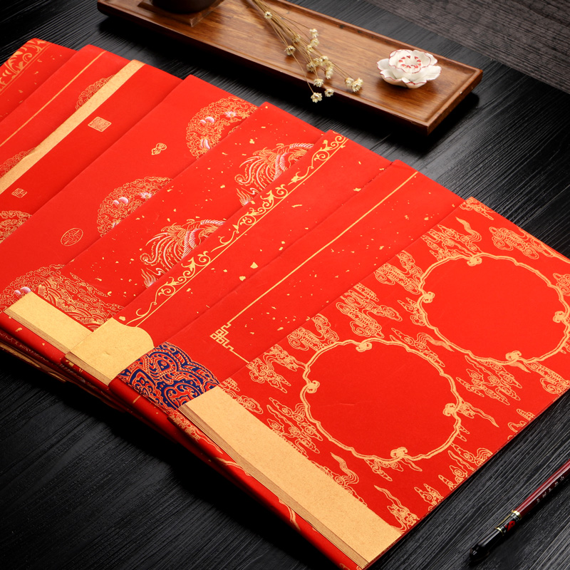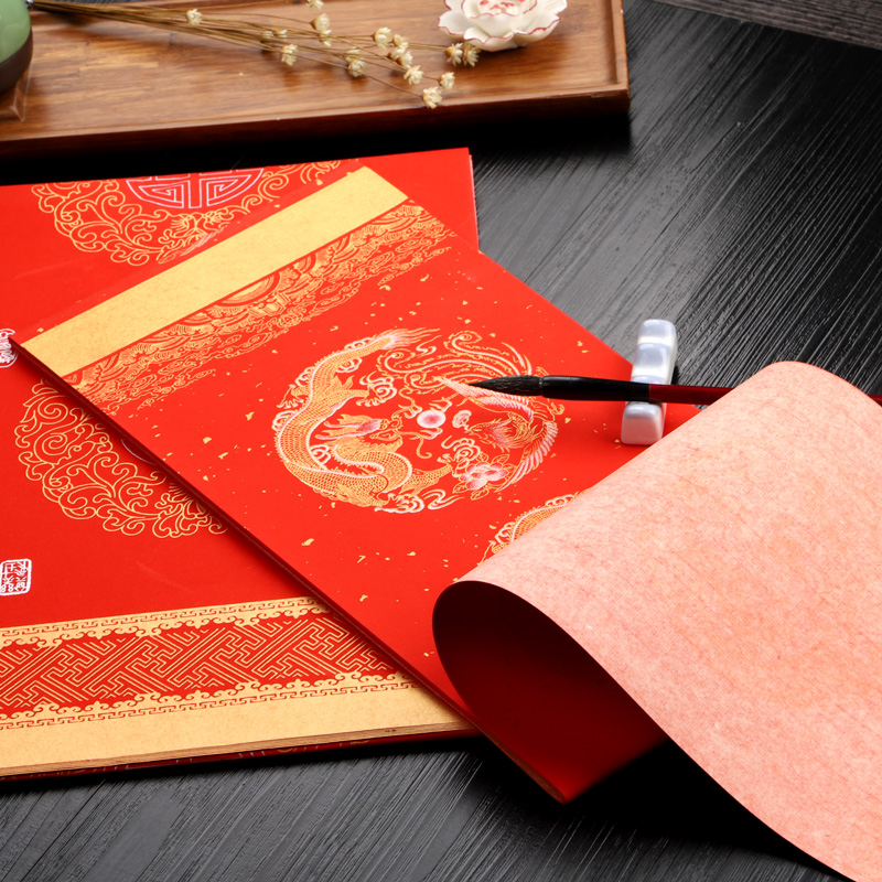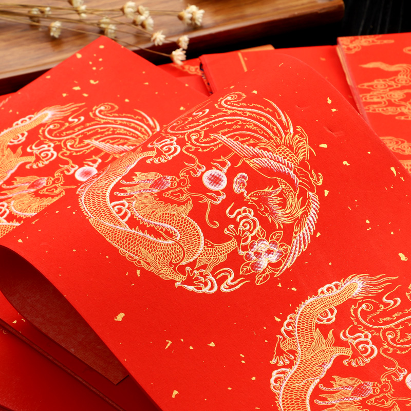 蜡染彩绘万年红对联纸高档宣纸五七九十一言洒金结婚对联大红纸加厚手写空白春联纸龙凤洒金烫金书法专用纸