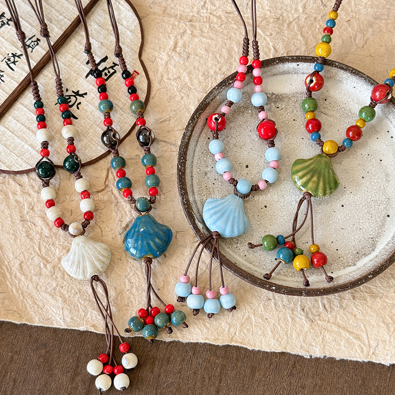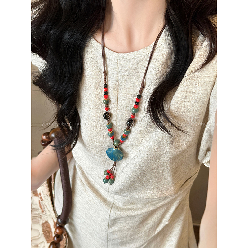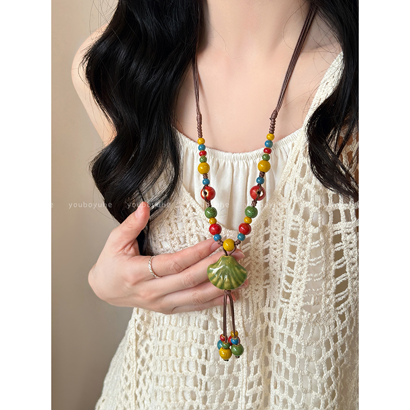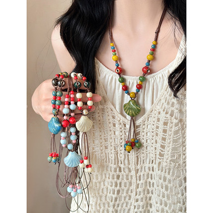 民族风陶瓷贝壳长款项链女波西米亚复古编绳毛衣链小众精致配饰品