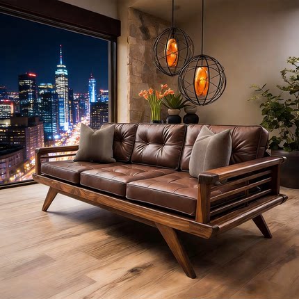 新中式实木沙发客厅直排2026新款现代简约小户型皮艺北美黑胡桃木