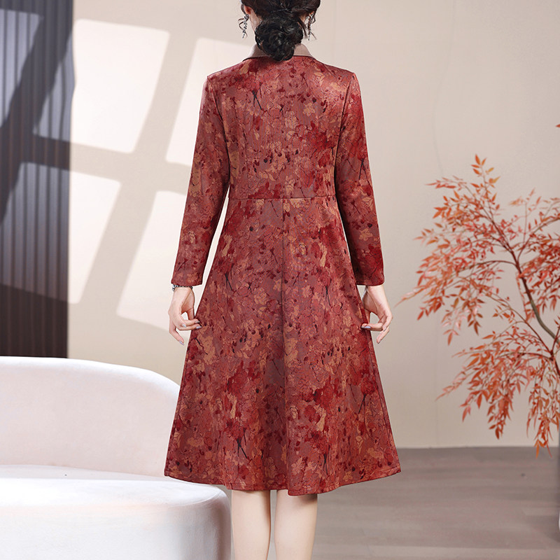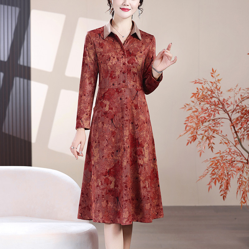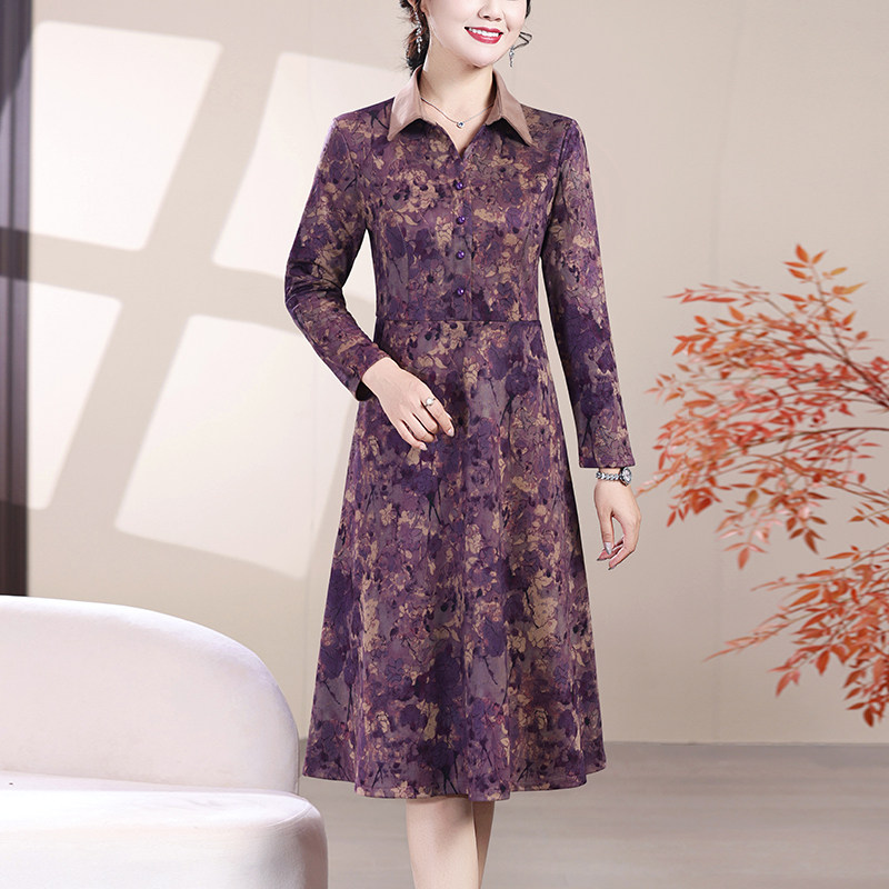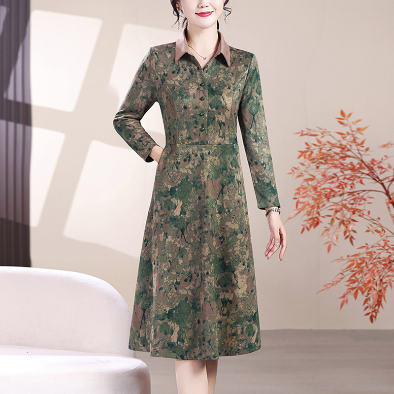 春秋新款衬衫领长袖印花连衣裙中老年女装气质妈妈秋冬厚款打底裙