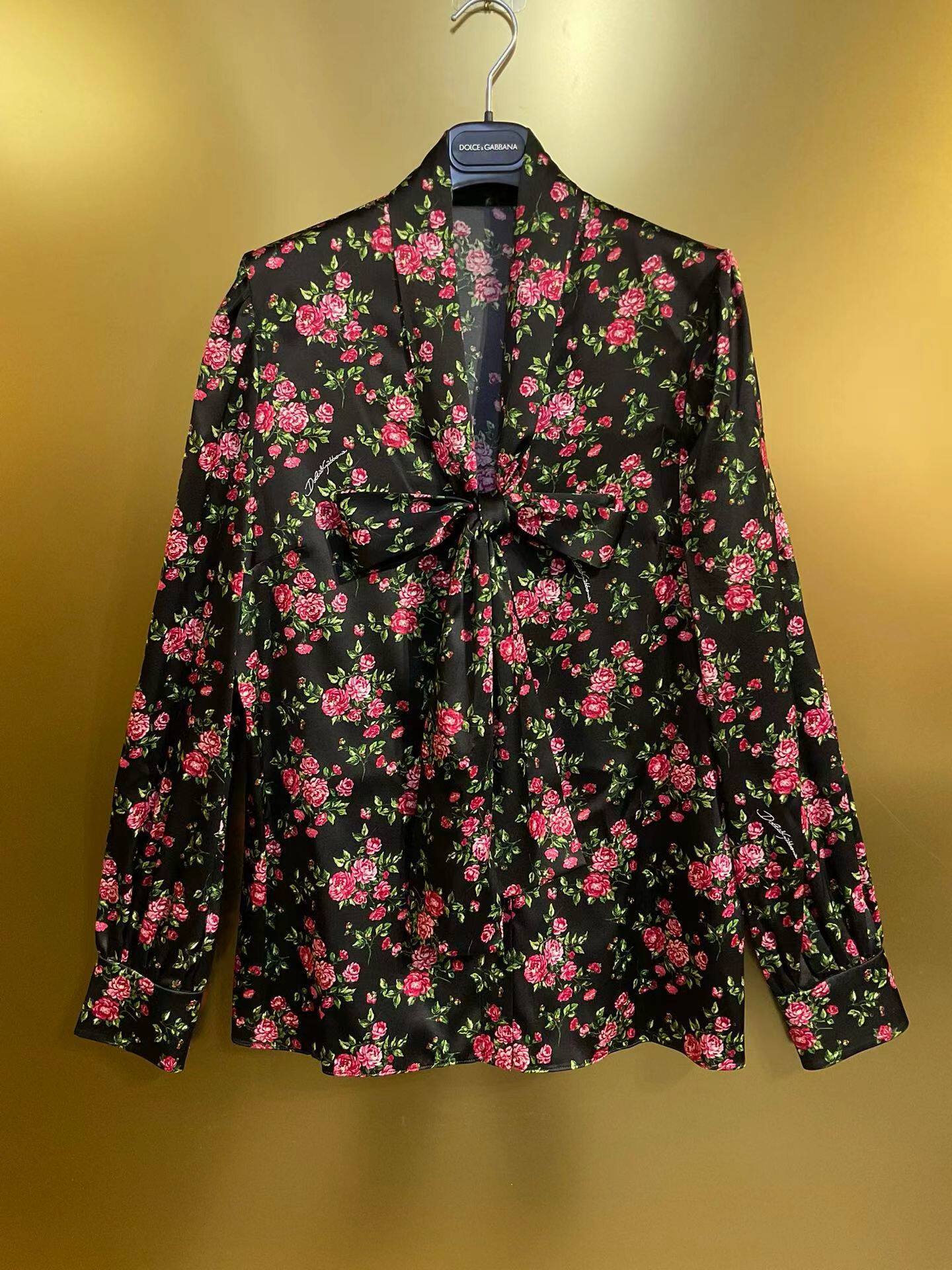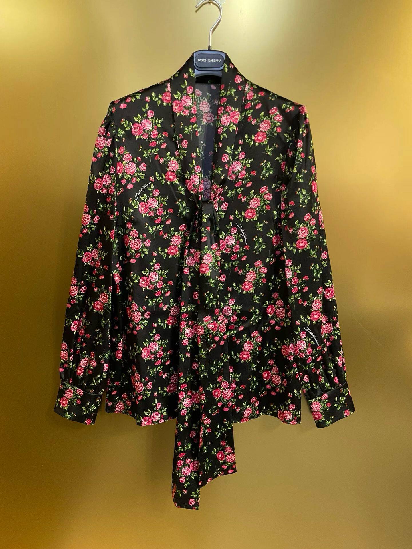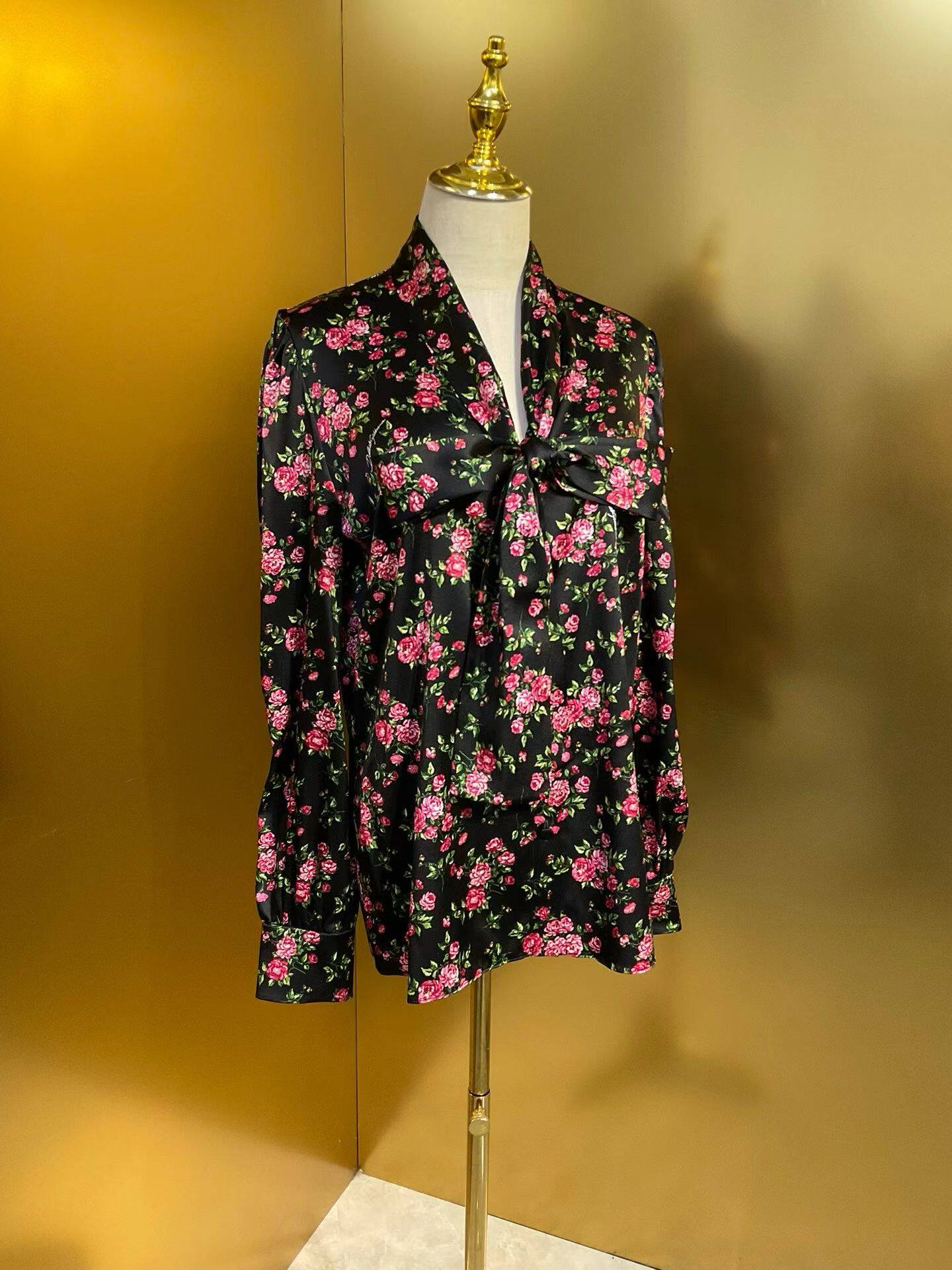欧美时尚女神D家同款黑底小玫瑰19姆米真丝弹力缎长袖衬衫