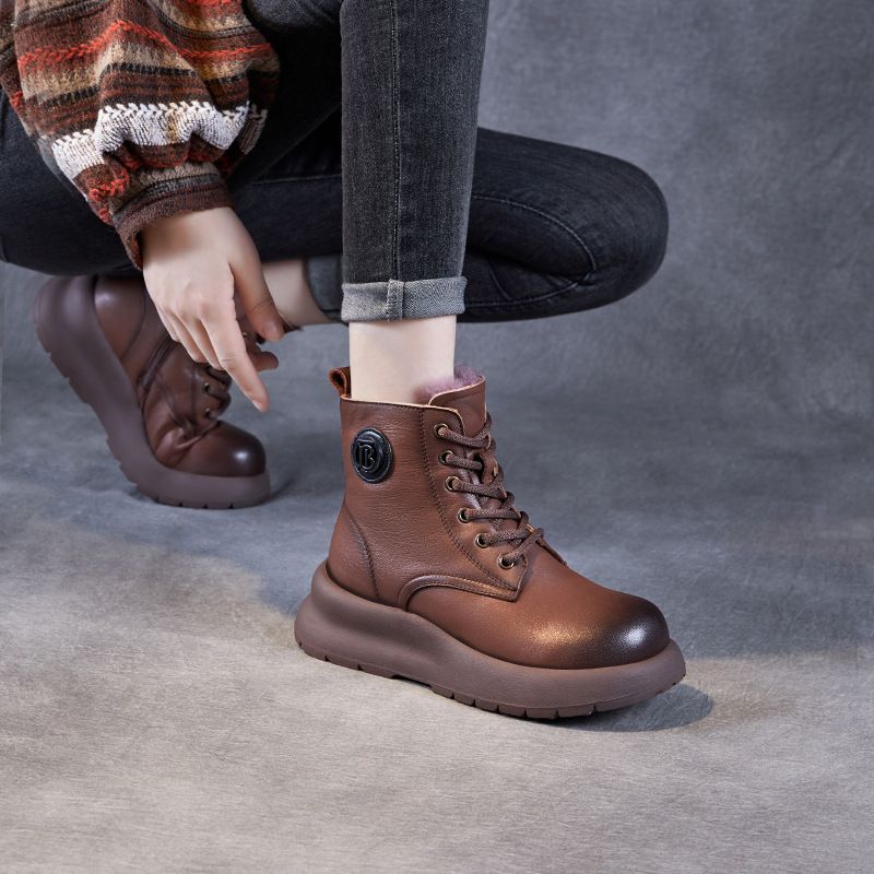 冬手工真皮羊毛短筒女靴圆头系带