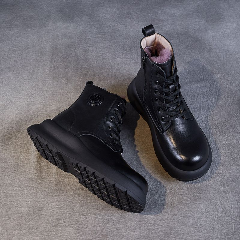 冬手工真皮羊毛短筒女靴圆头系带中跟大码马丁靴头层牛皮保暖棉靴
