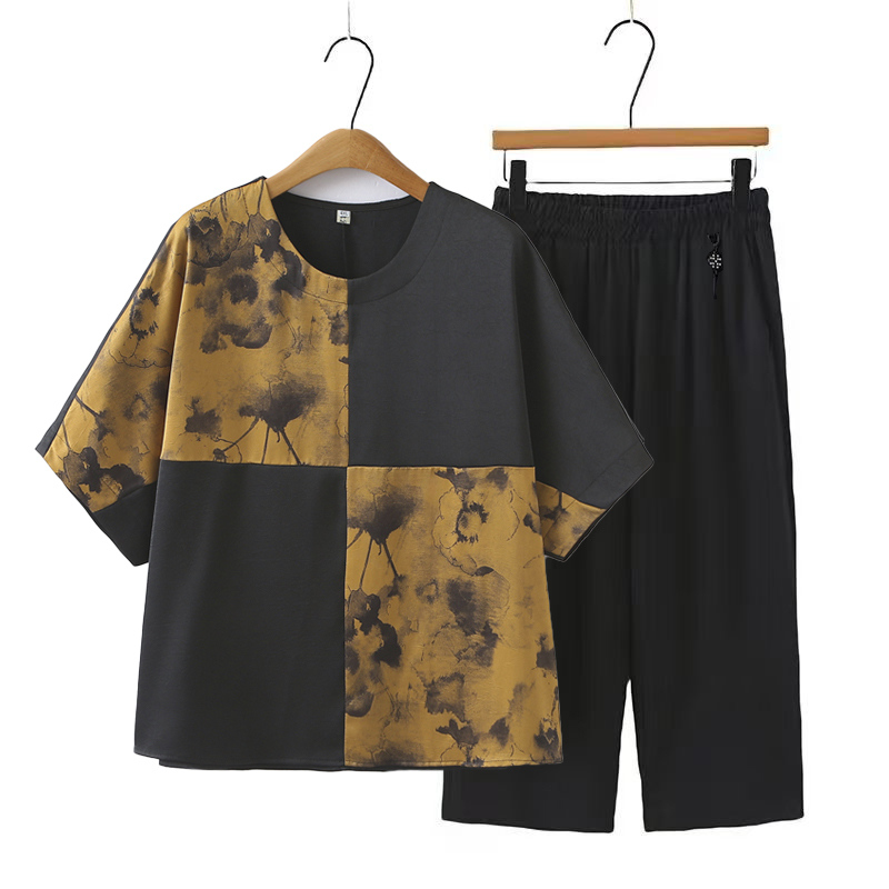 中老年人妈妈夏装缎面印花短袖T恤套装女大码胖妈妈50岁奶奶200斤