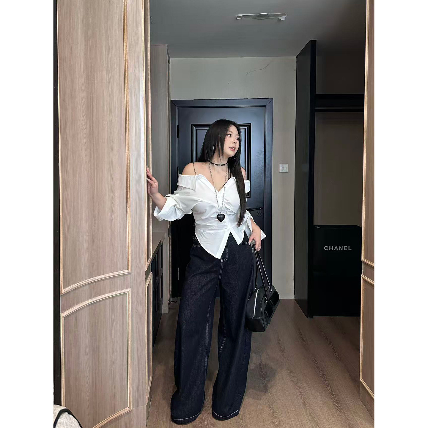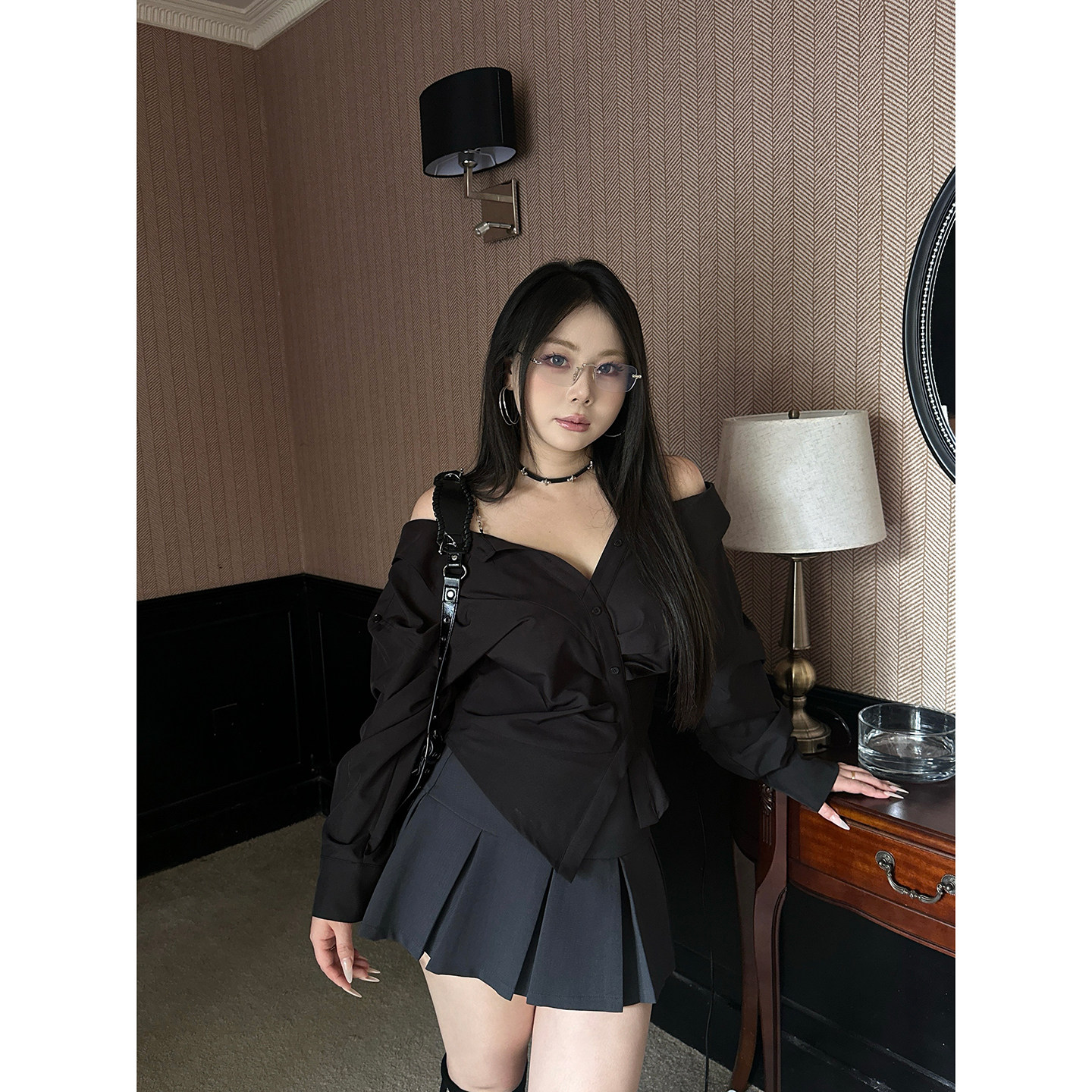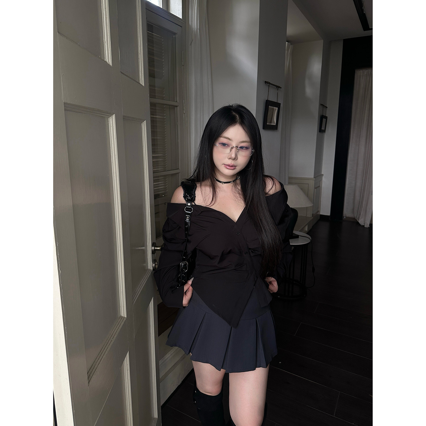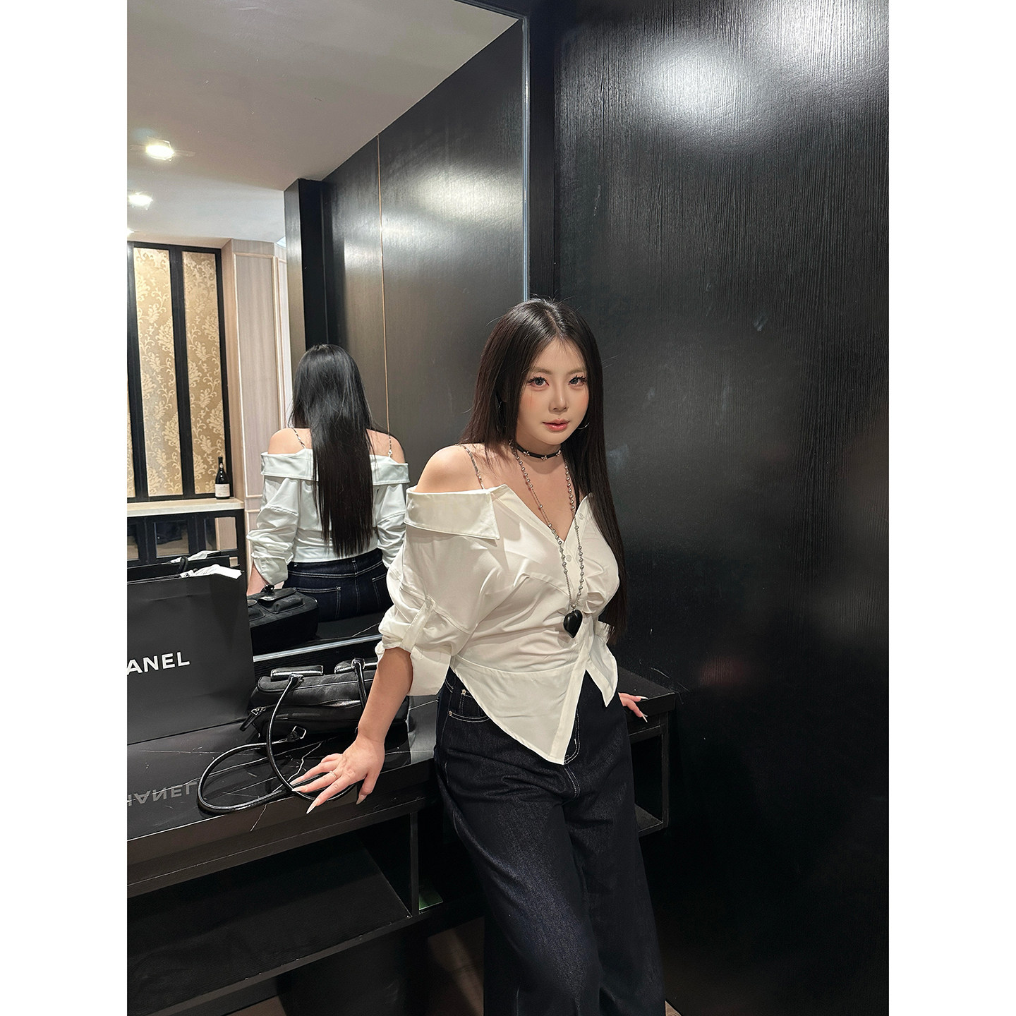 大小姐微胖大码“心动曲率”纯欲风一字肩吊带不对称长袖收腰衬衫