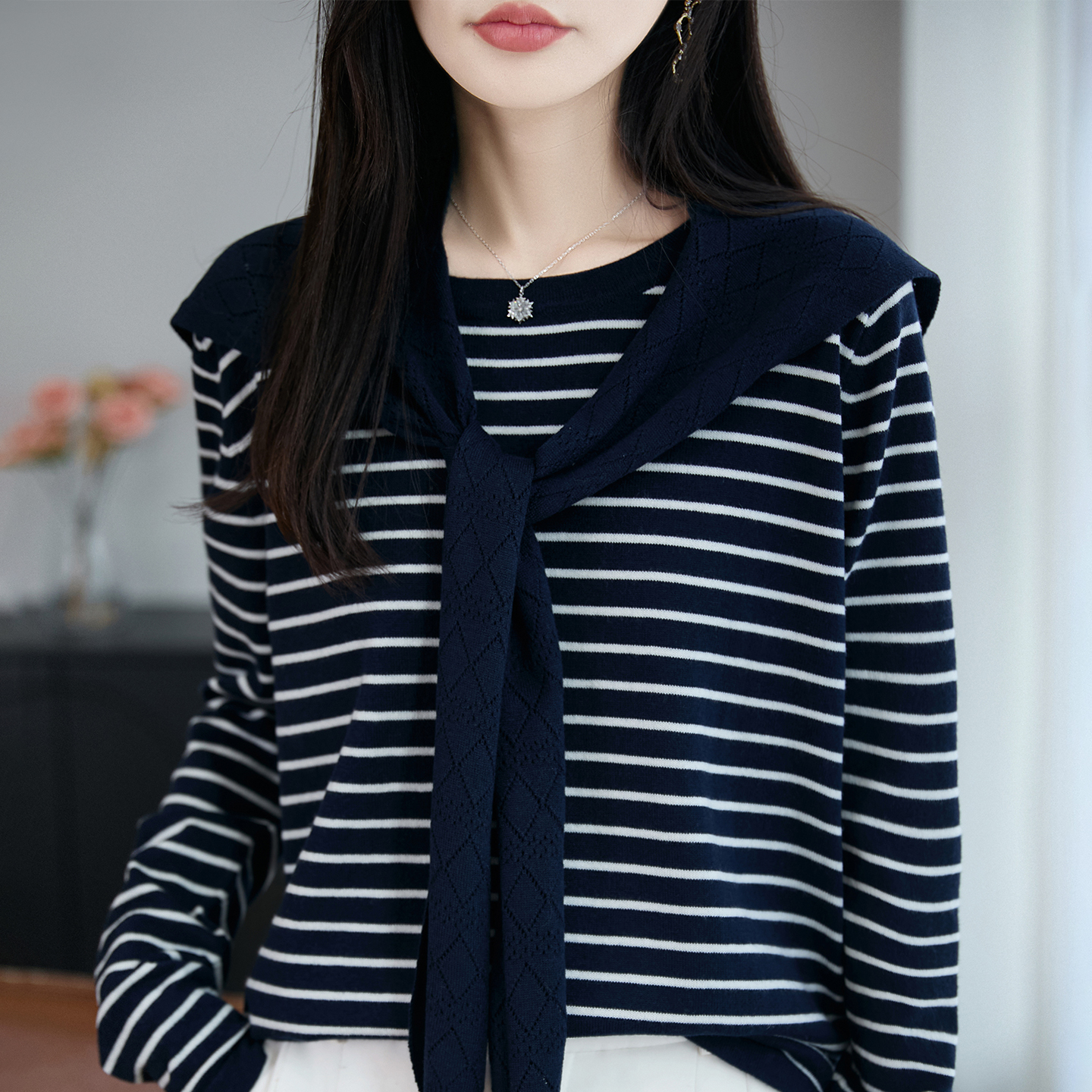2025新款条纹披肩两件套针织衫女早秋薄款打底衫内搭长袖绑带上衣