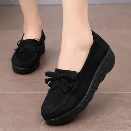 春秋老北京布鞋女鞋单鞋松糕豆豆鞋厚底坡跟蝴蝶结百搭黑色工作鞋