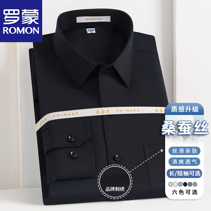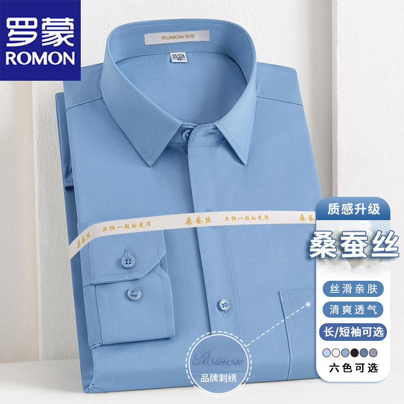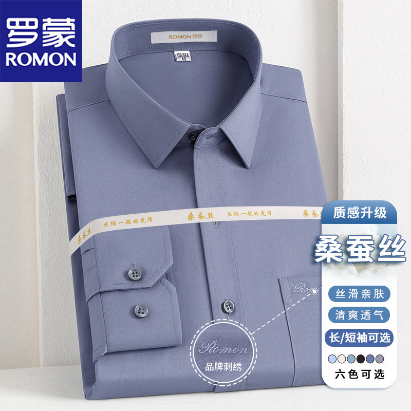罗蒙桑蚕丝长袖衬衫男士春秋新款商务休闲正装免烫易打理白衬衣男