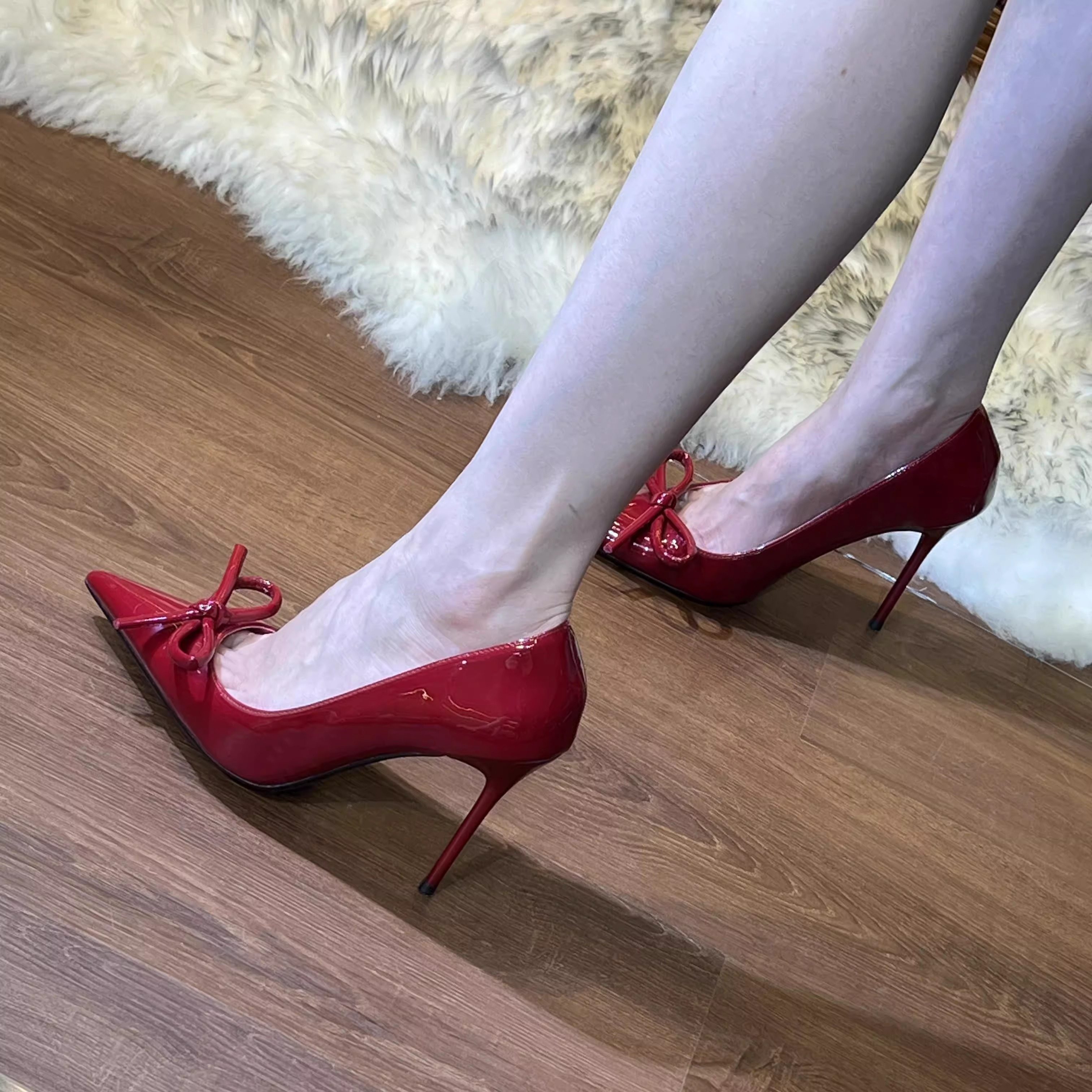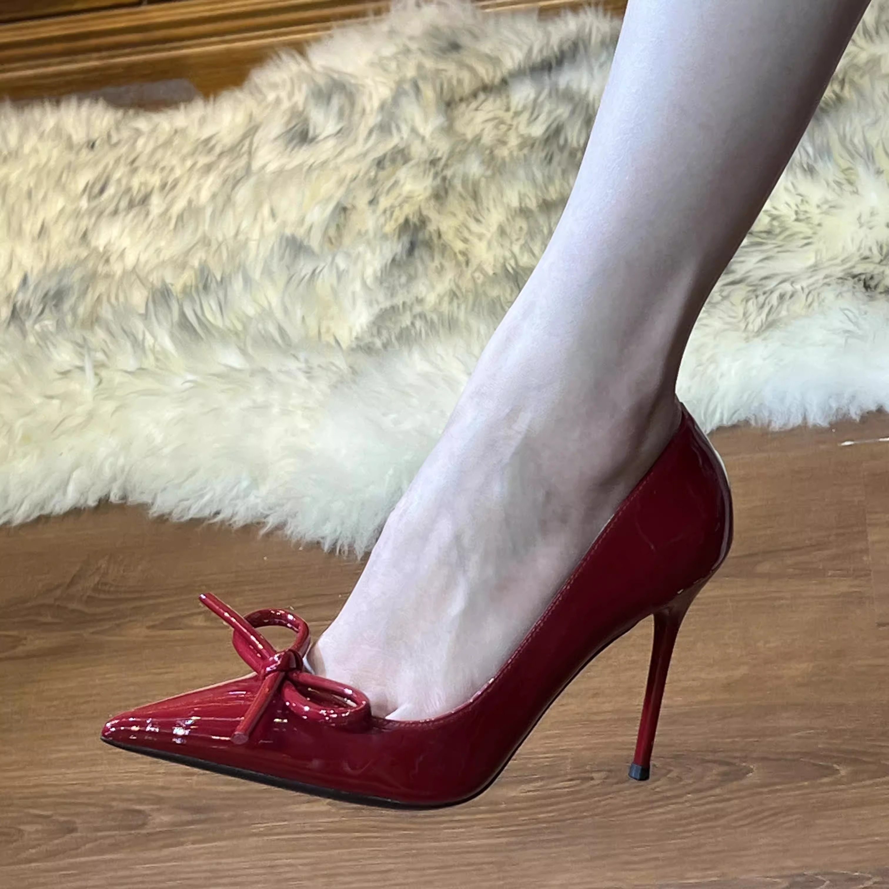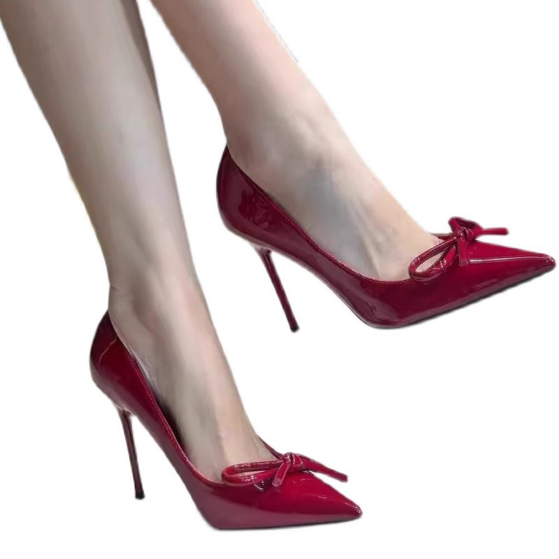 2025新款酒红色高跟鞋女尖头蝴蝶结法式漆皮气质细跟绝美小众单鞋