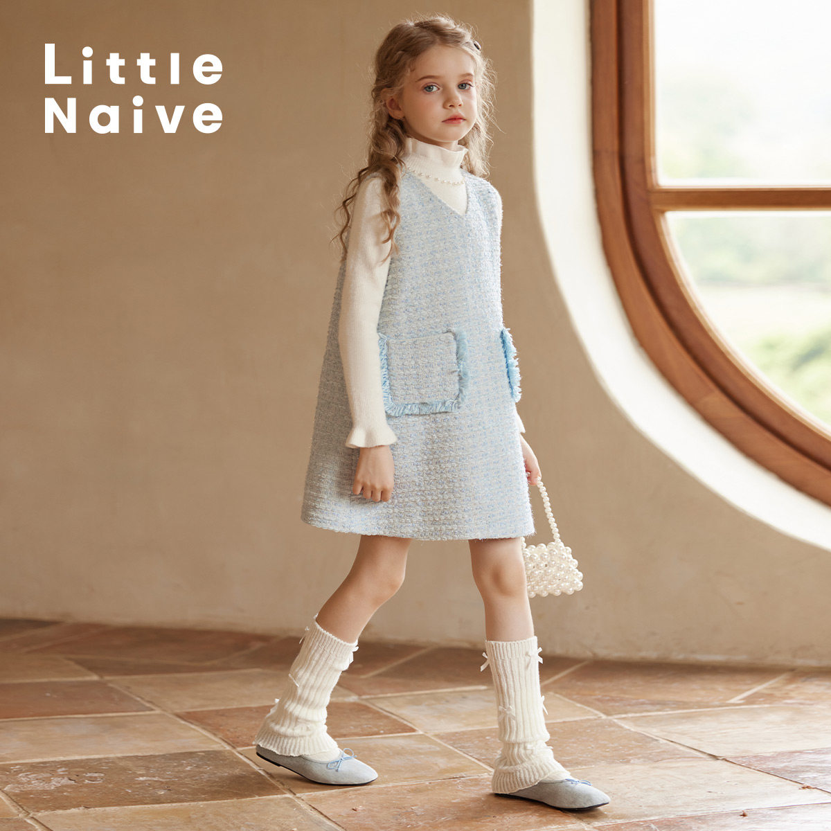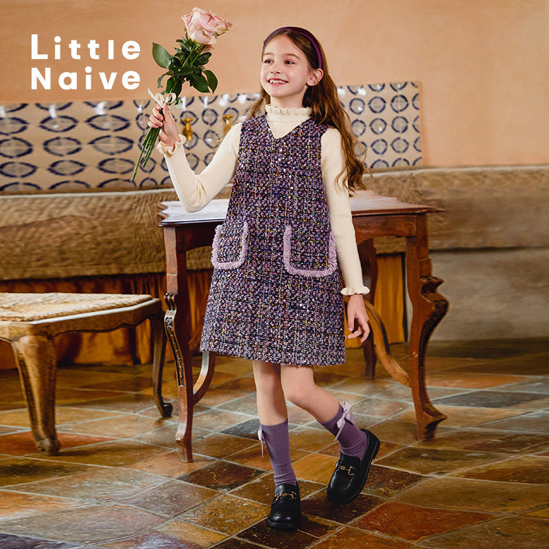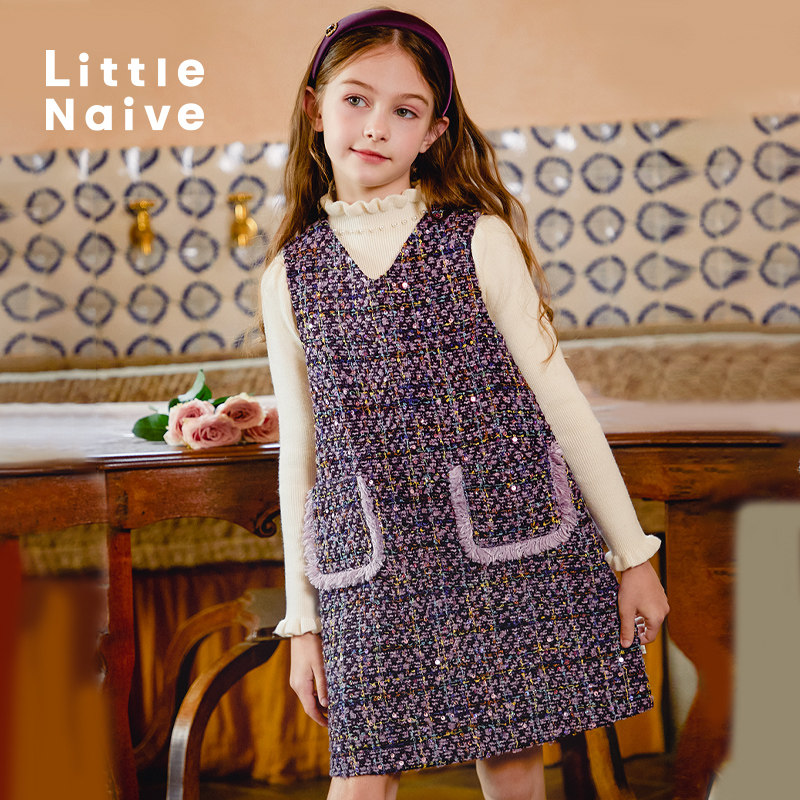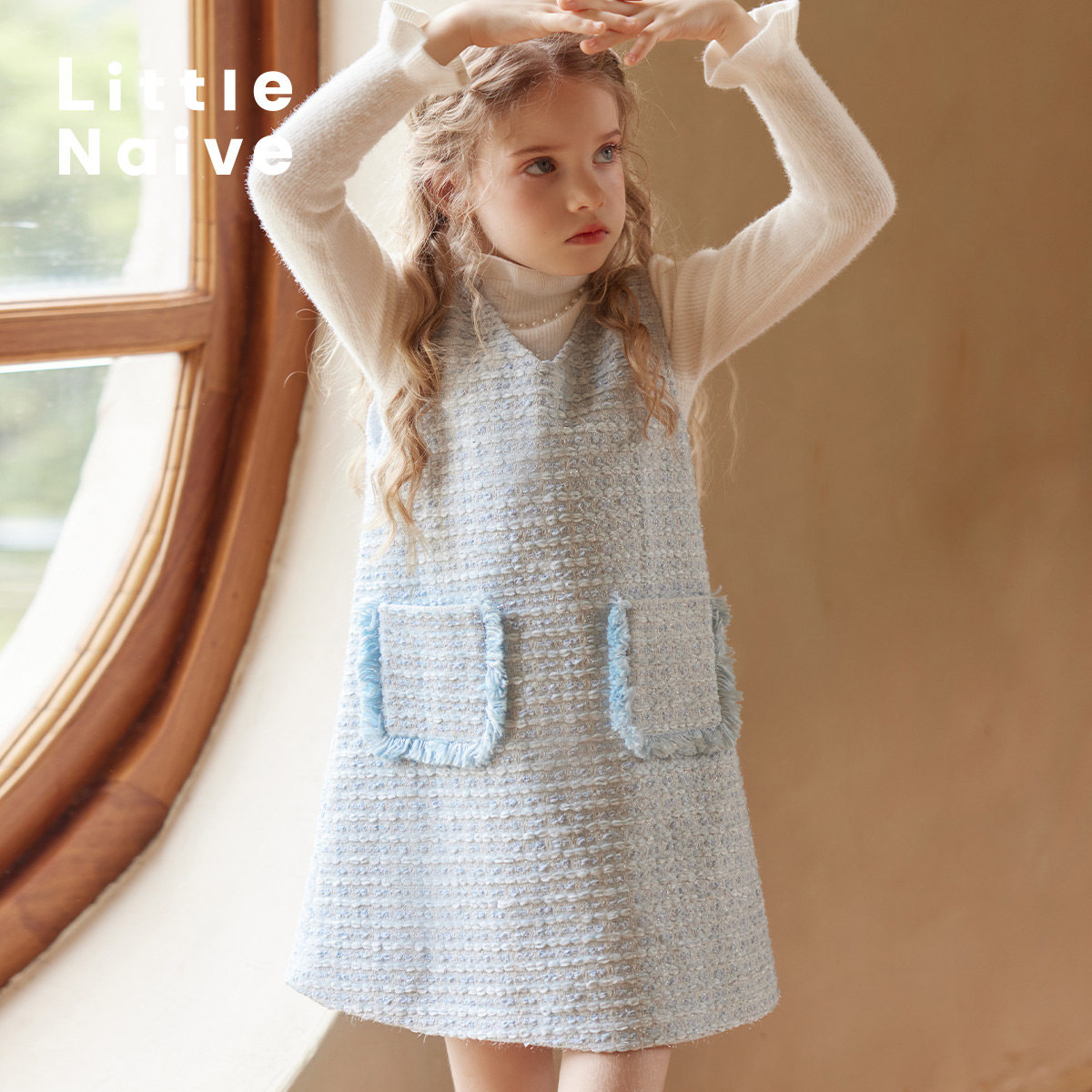 LittleNaive儿童连衣裙春秋新款时髦珠片裙子女童v领小香风背心裙