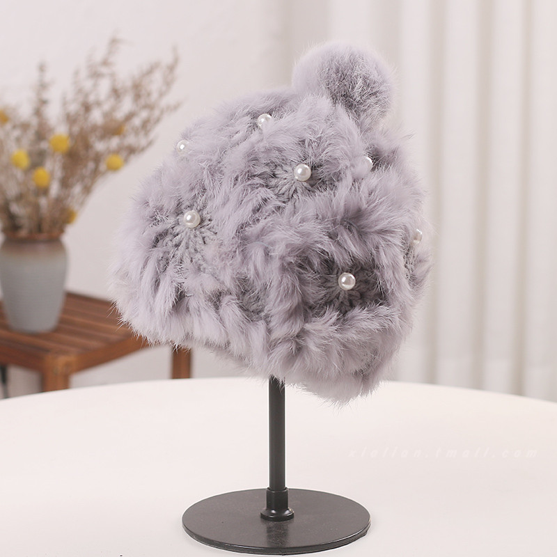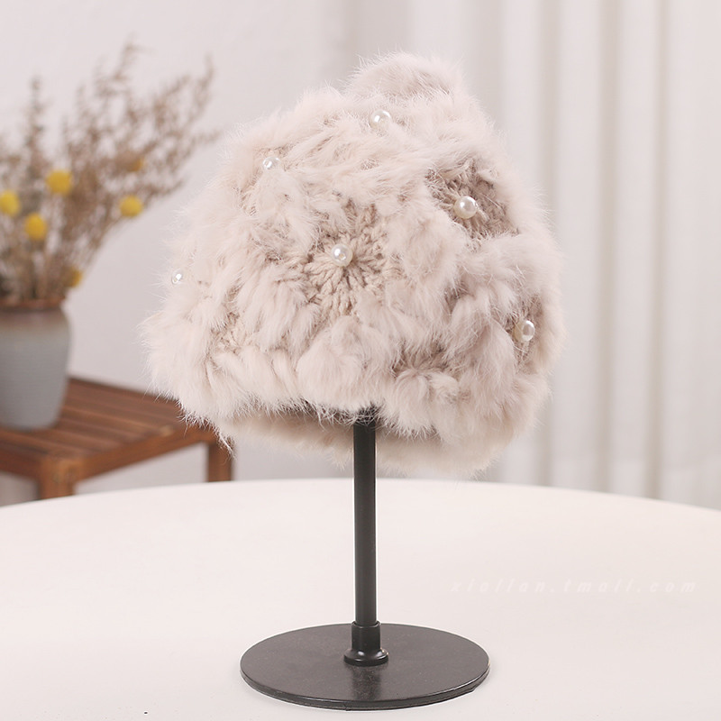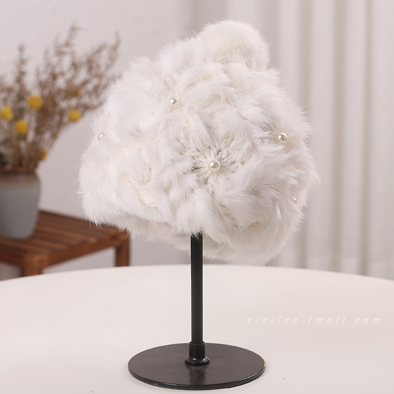 秋冬保暖手工钩针兔毛皮草针织毛线帽子女韩版可爱镂空花朵包头帽