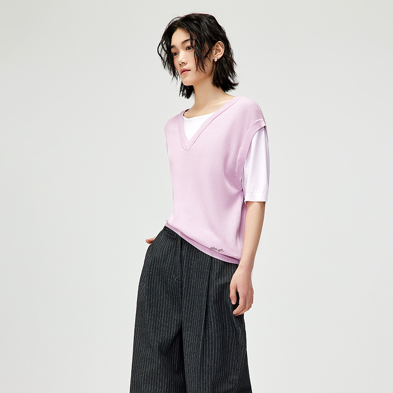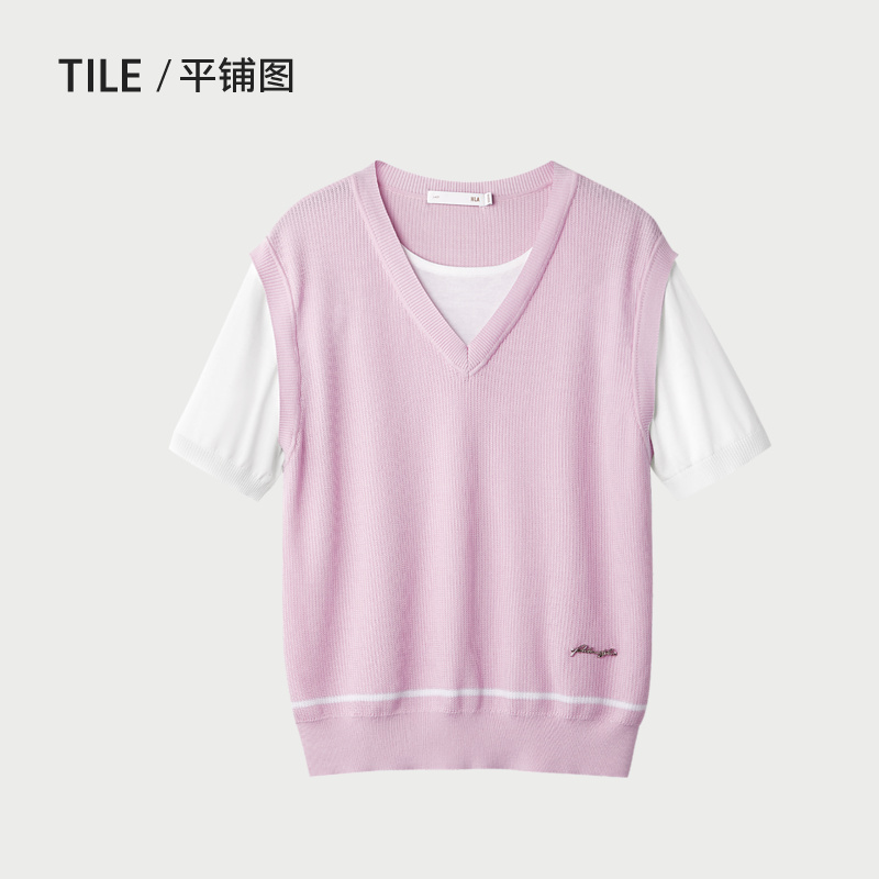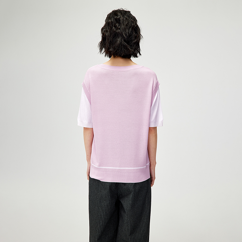 HLA/海澜之家撞色显瘦短袖针织衫2025夏季新款假两件时尚上衣女装