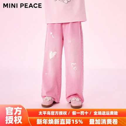 MINIPEACE太平鸟童装女童牛仔裤秋季新款印花粉色儿童拖地长裤