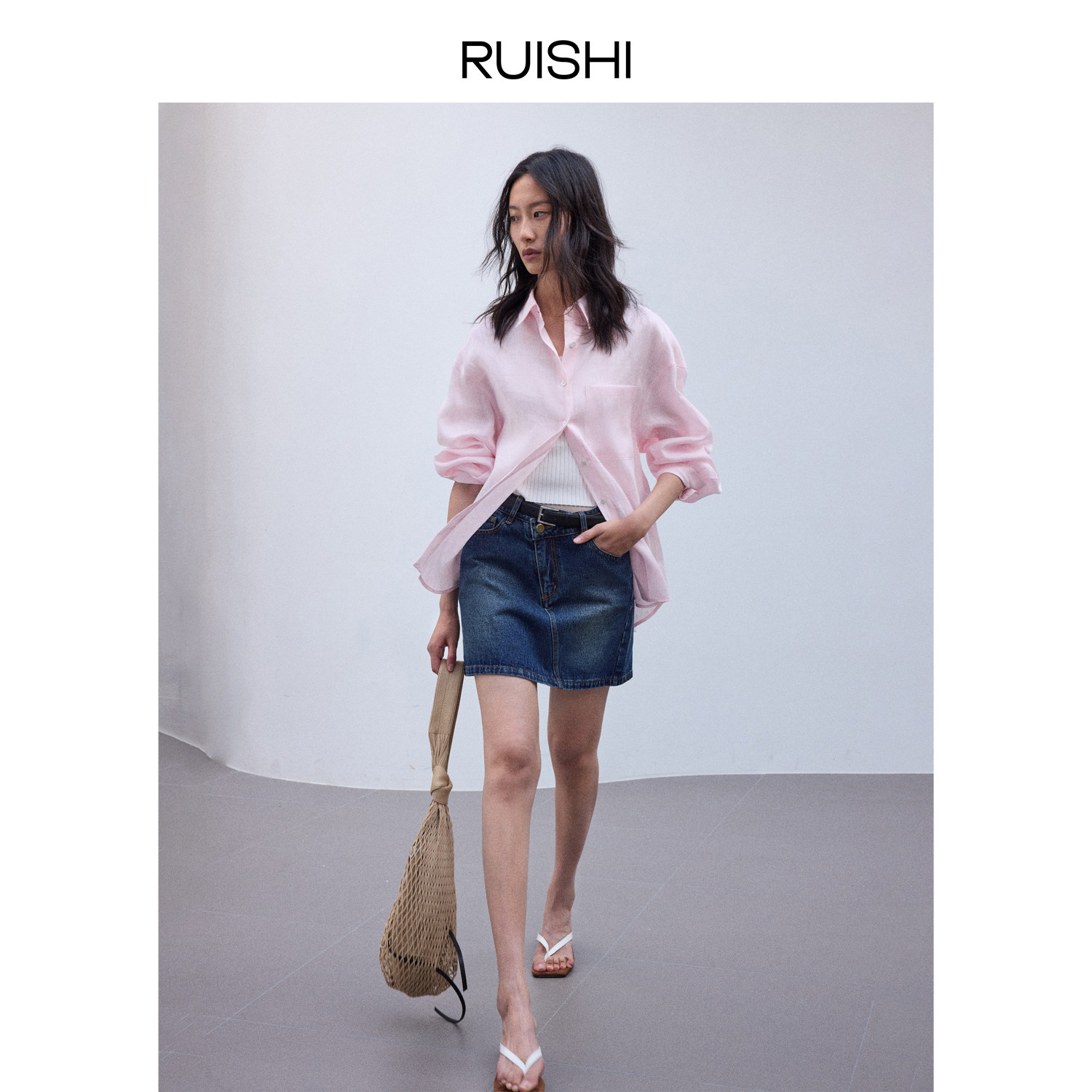 RUISHI芮时 100亚麻老钱风落肩长袖宽松慵懒上衣休闲衬衫女夏