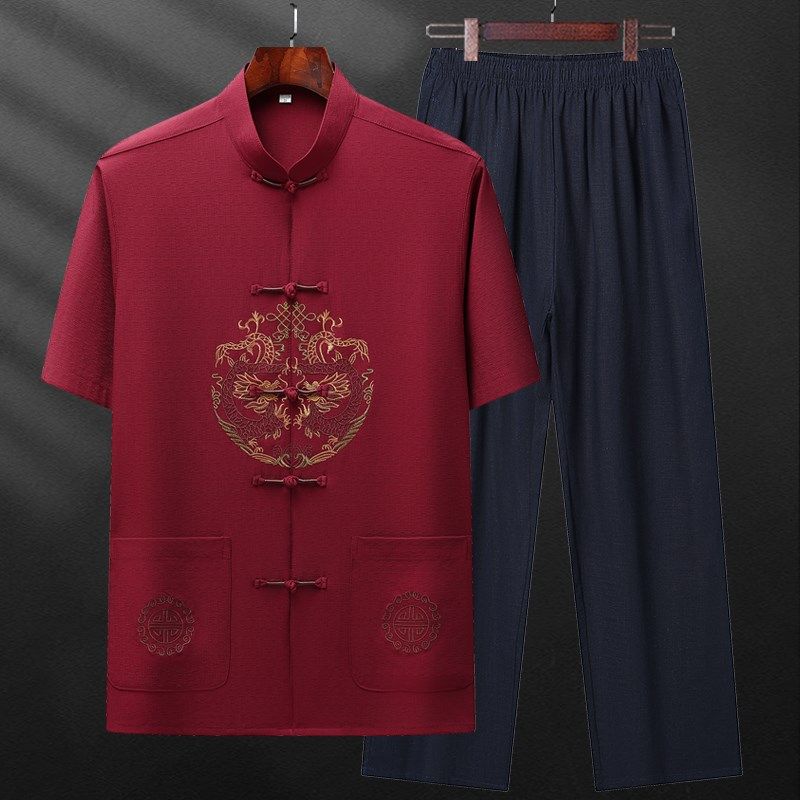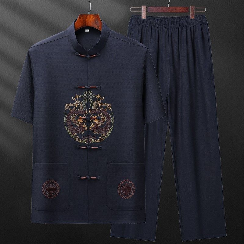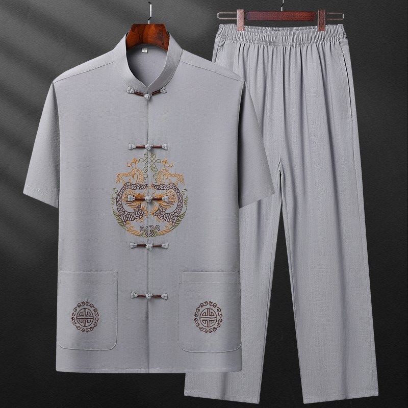 唐装棉麻套装中国风男装中老年短袖夏季薄款爷爷夏装老人父亲衣服