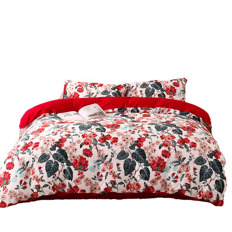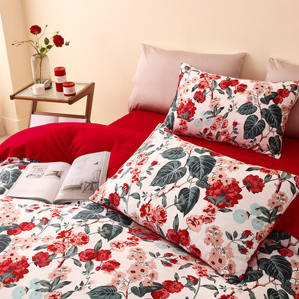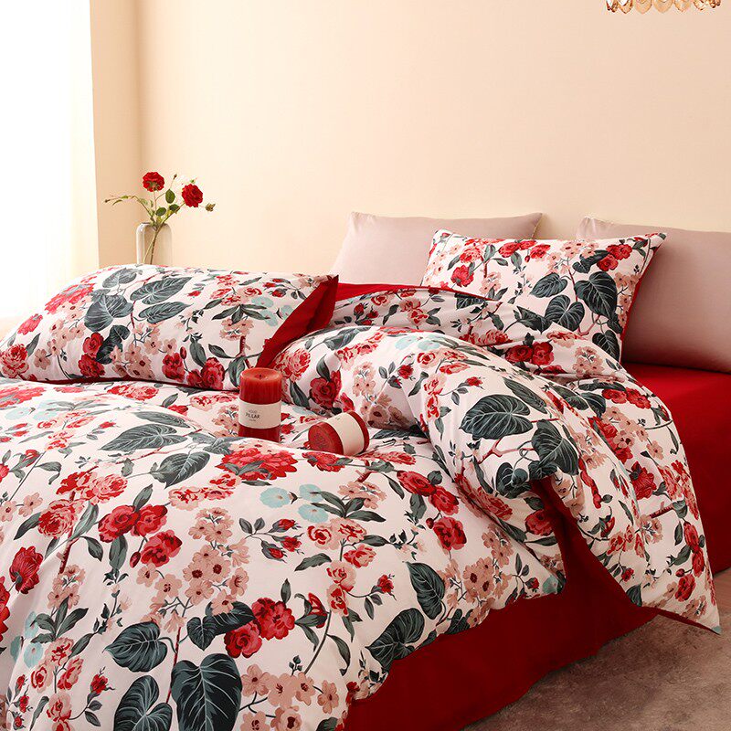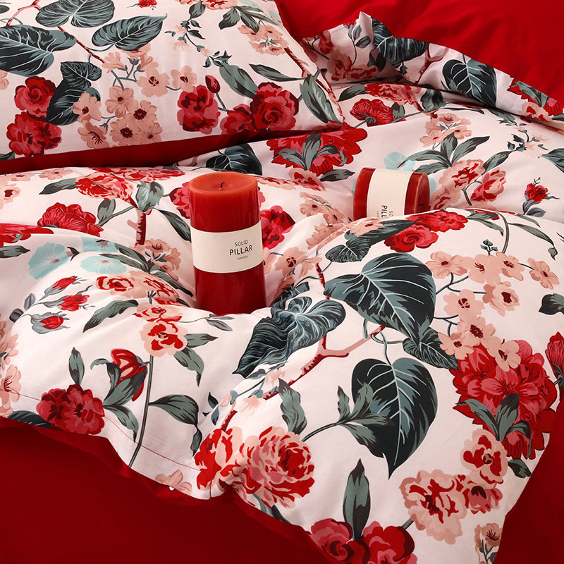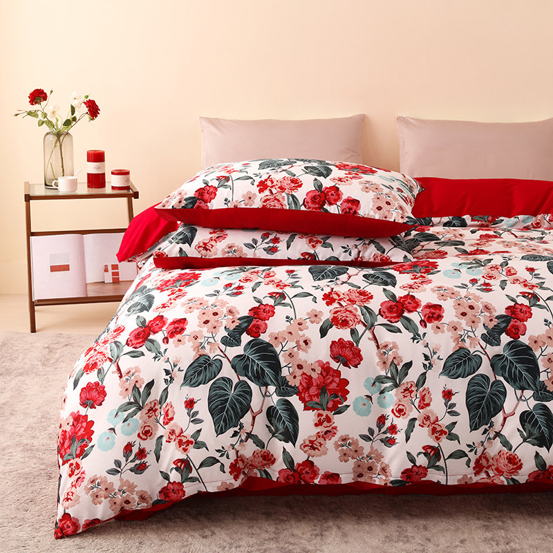 乐优公主100支长绒棉结t婚四件套大红色被套床单喜被婚庆床上用品