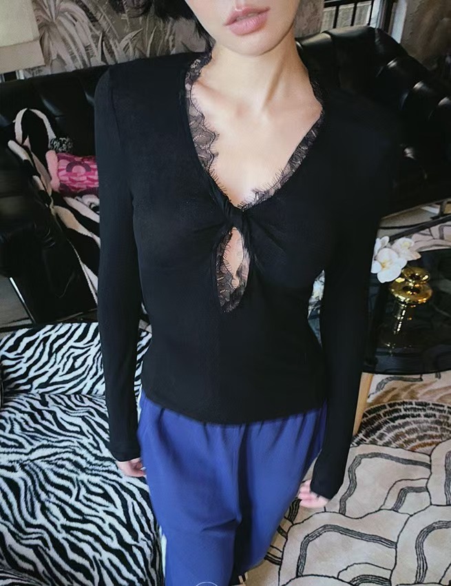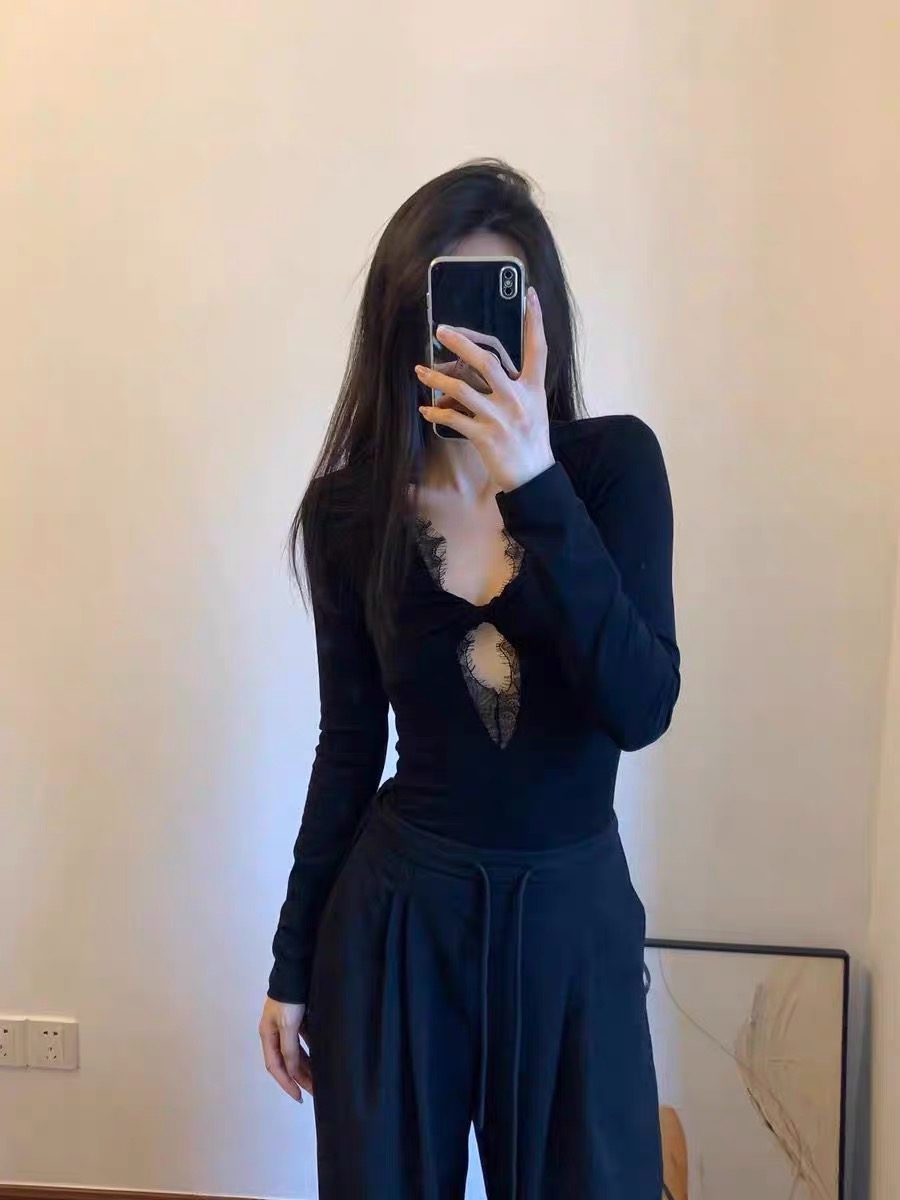 纯欲辣妹风黑色蕾丝拼接黑色扭结打底衫修身显瘦高级感上衣