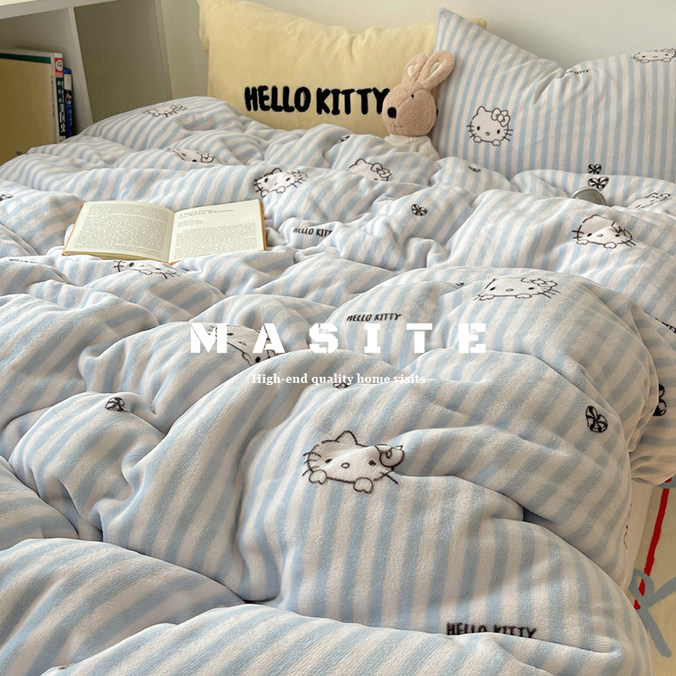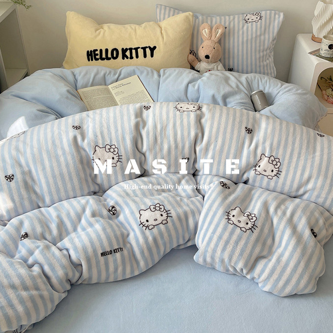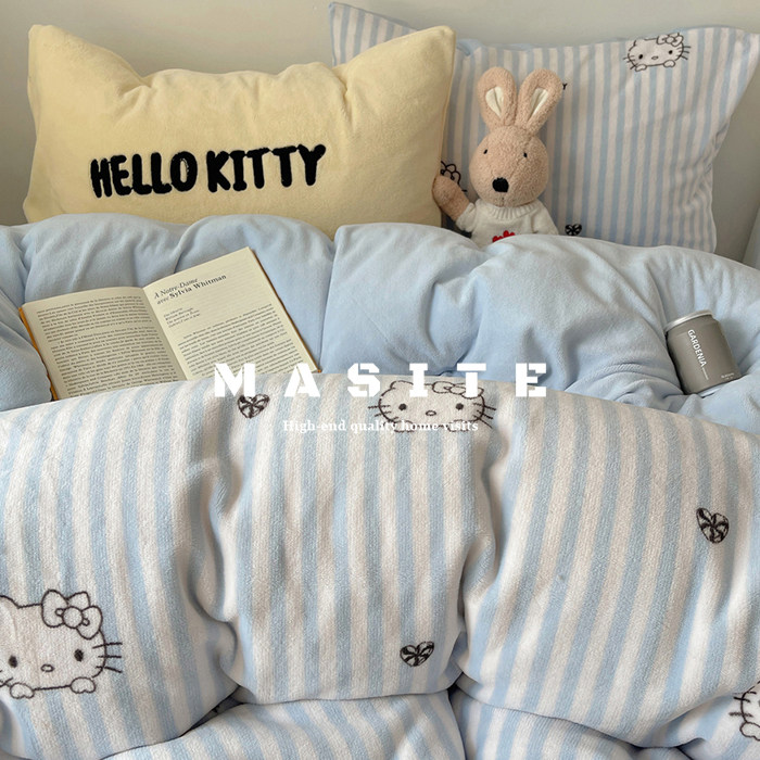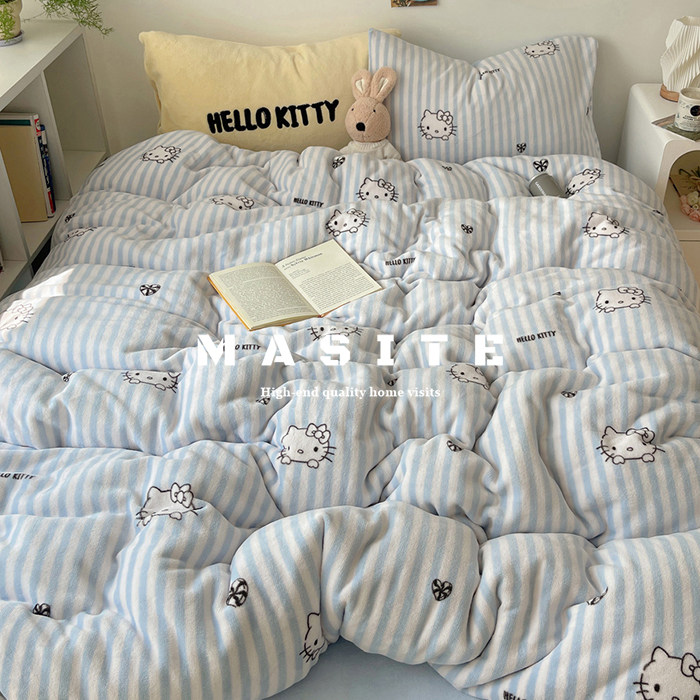 高端可爱KT猫牛奶绒床上四件套卡通冬季加厚珊瑚绒床单被套三件套