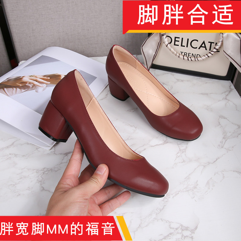 2025年新款春秋季妈妈鞋软皮软底浅口粗跟女鞋子百搭中跟单鞋高跟