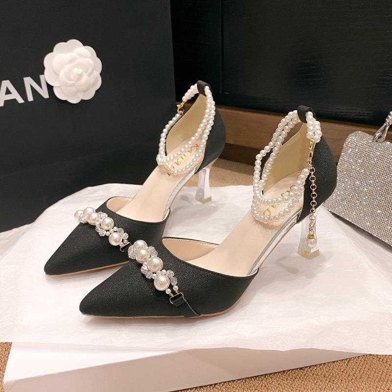 细跟包头凉鞋女新款春季外穿尖头高跟鞋高级感浅口串珠单鞋女