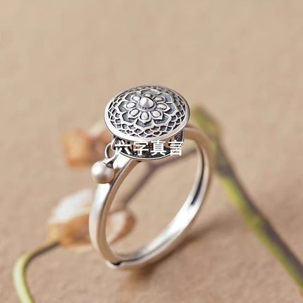 S925纯银招财转运轮戒指复古做旧国风国潮女款六字真言可旋转开口