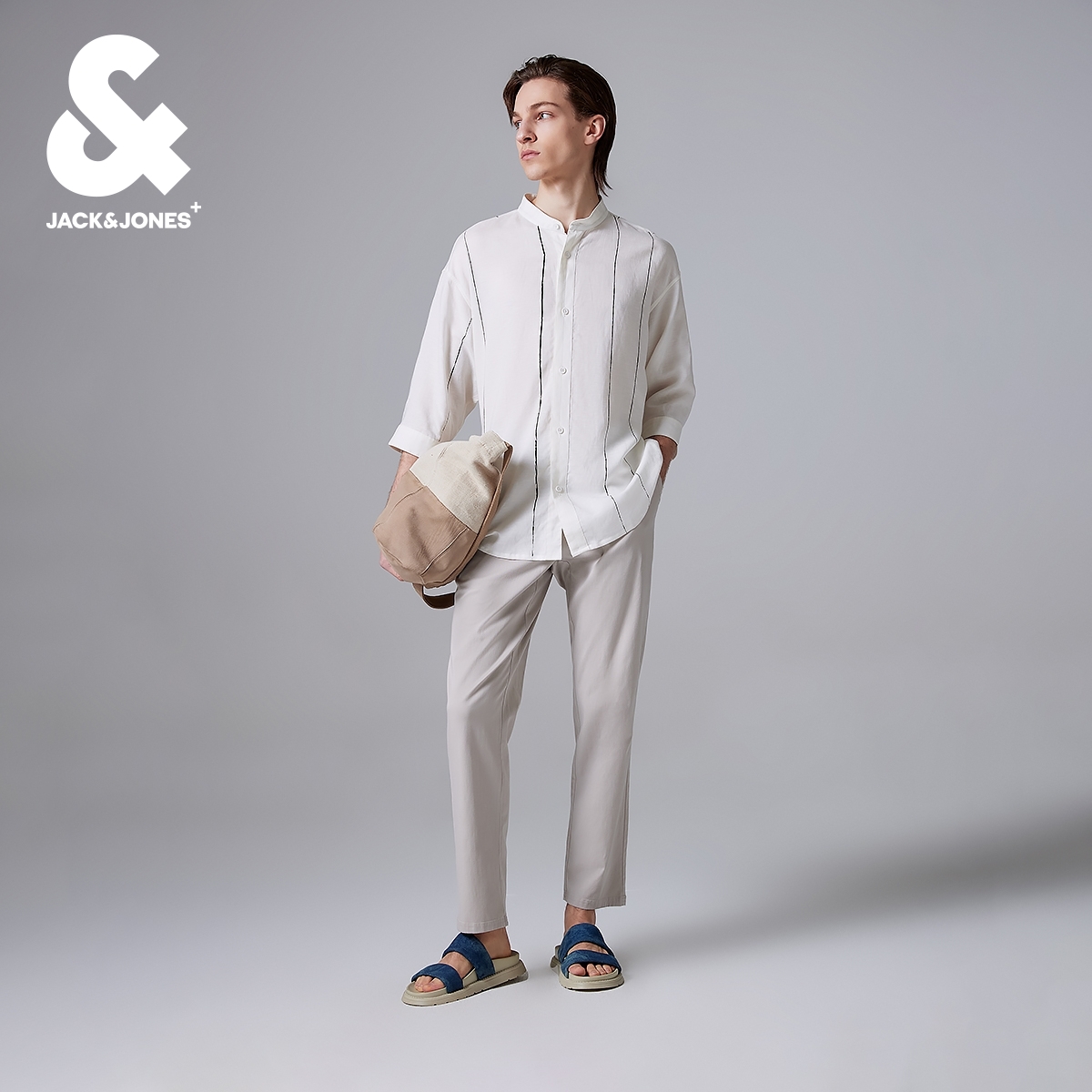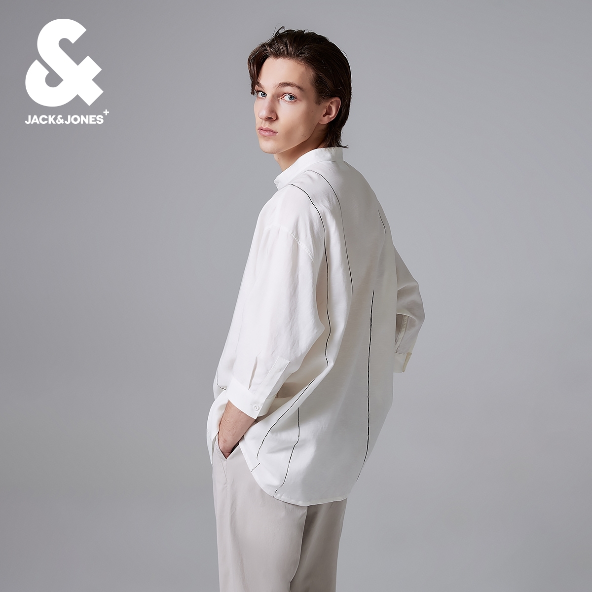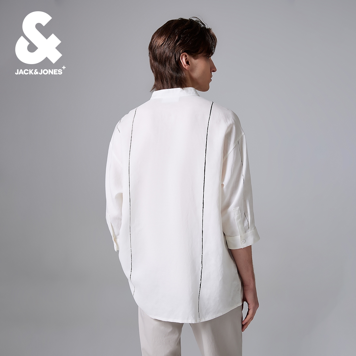 杰克琼斯秋季新款百搭简约风休闲立领日常百搭宽松七分袖衬衫男装