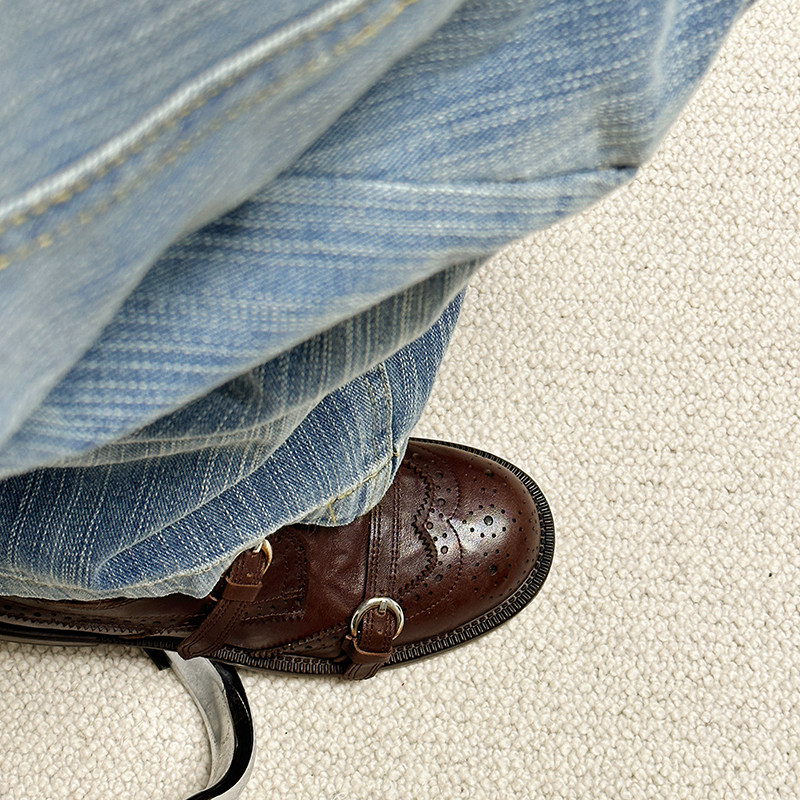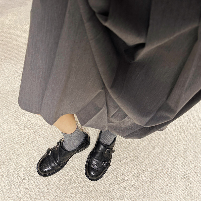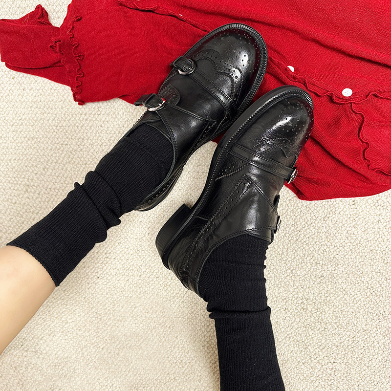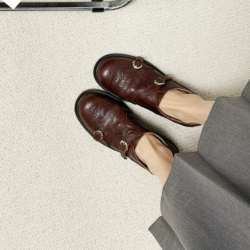 鹿先生圆头英伦布洛克雕花一字带乐福鞋女百搭深口单鞋复古小皮鞋