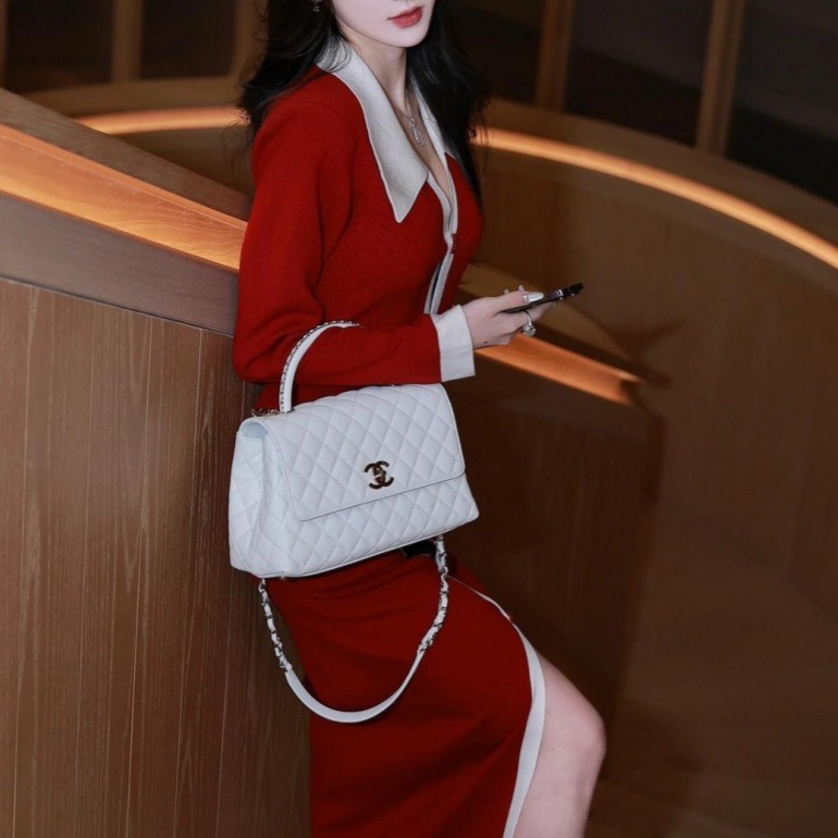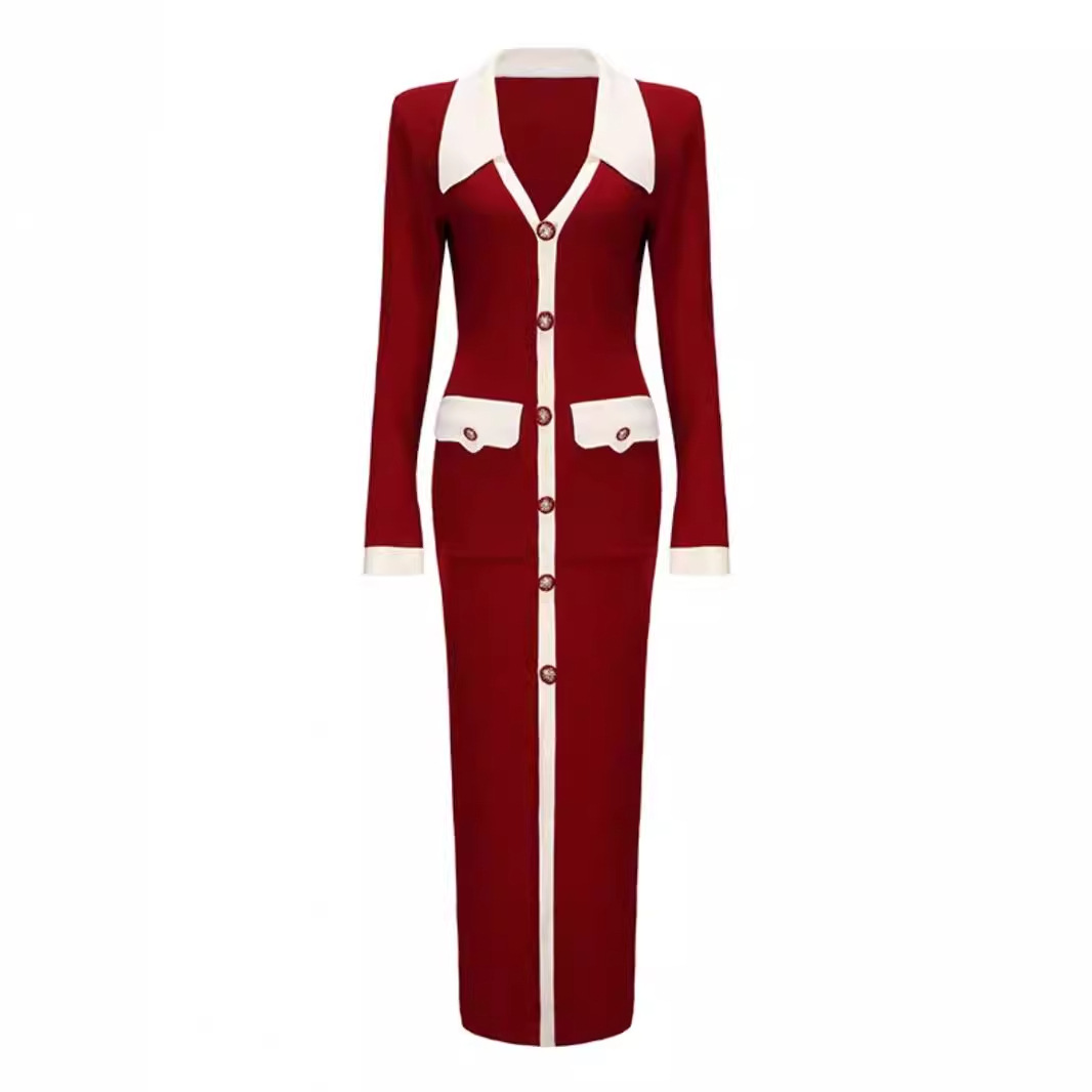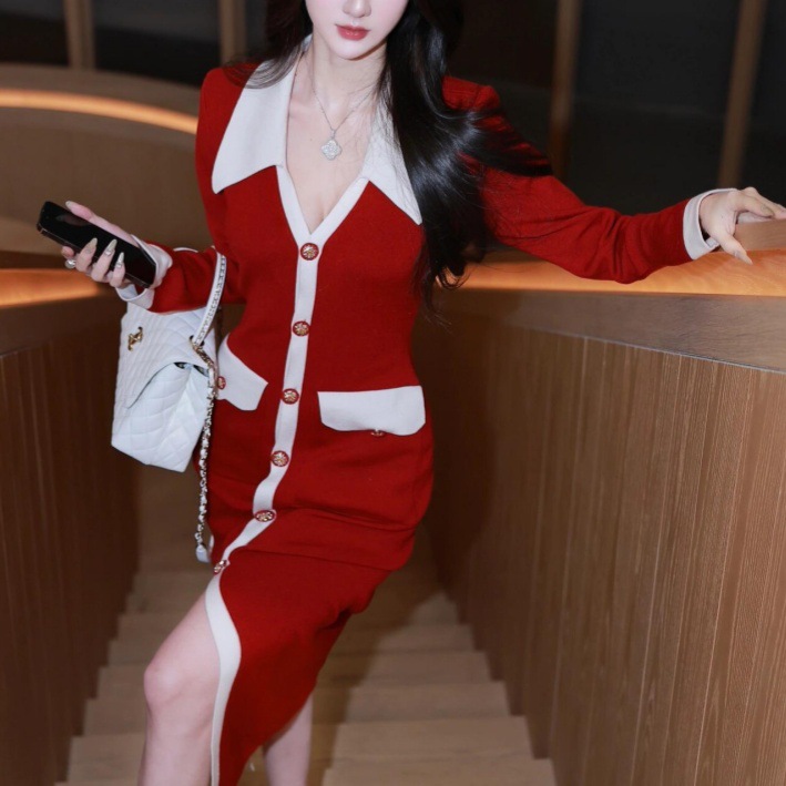 小香风红色长款针织连衣裙女2025春秋季新款小众撞色翻领修身