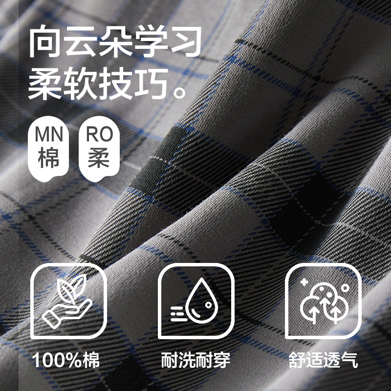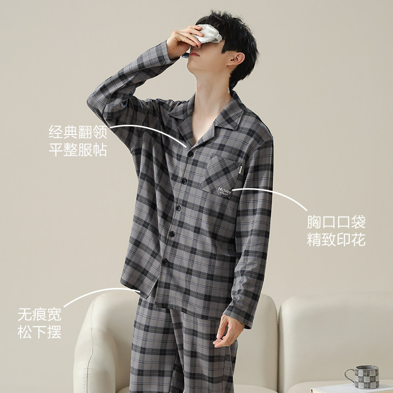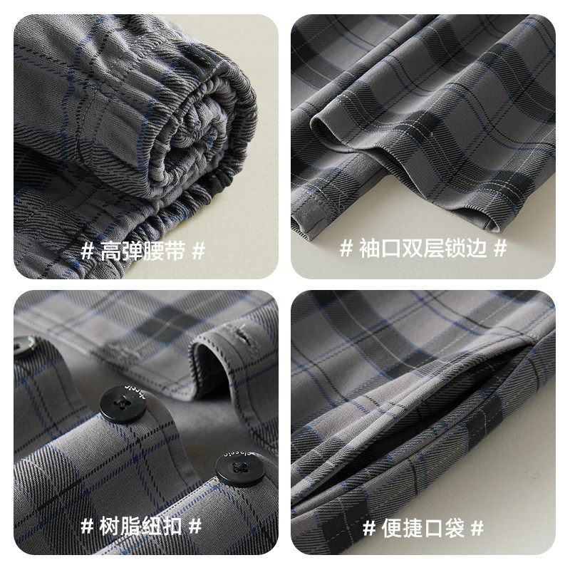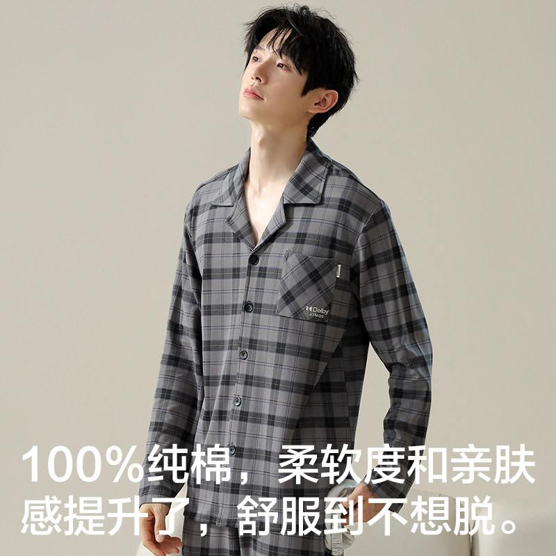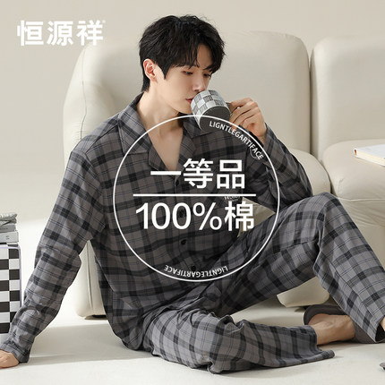 恒源祥纯棉睡衣男2024新款休闲家居长袖翻领格子秋冬男士睡衣套装