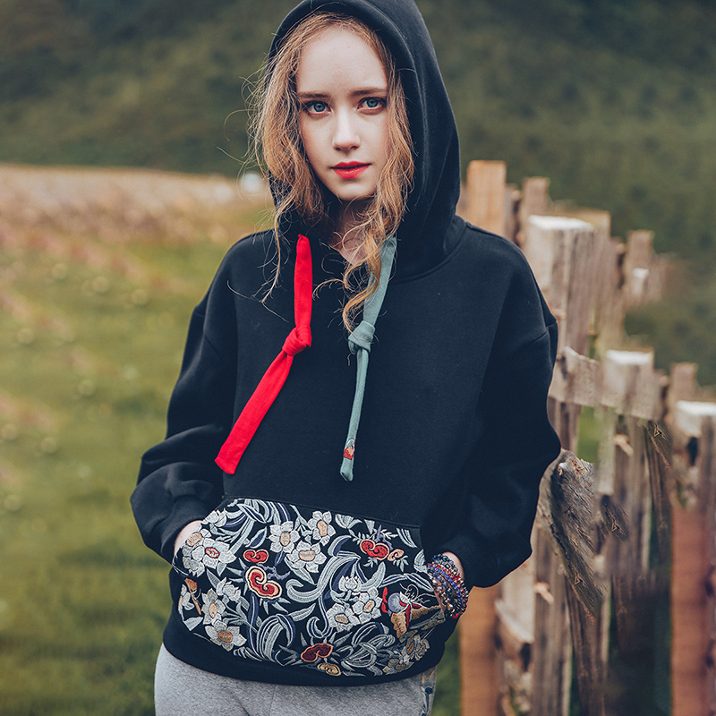 裂帛原创设计2023年冬新品民族风刺绣休闲连帽套头卫衣女