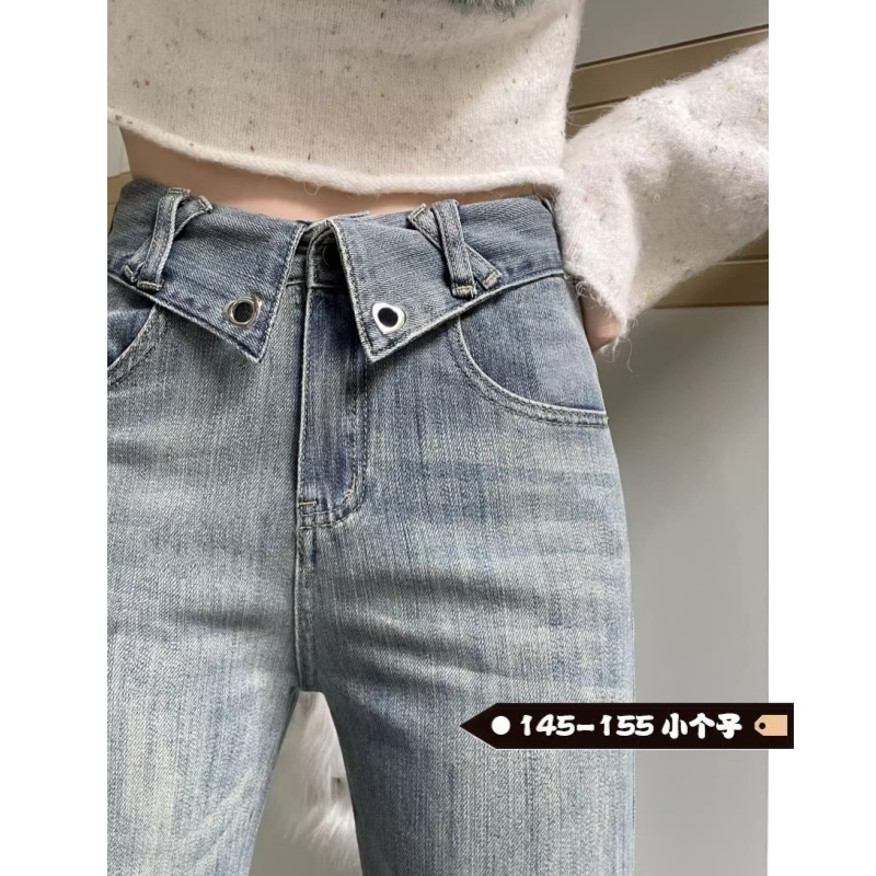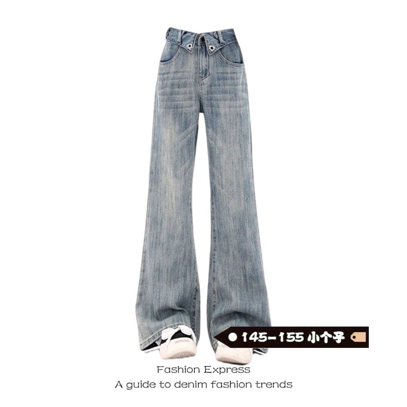 小个子一米五微喇复古翻边设计牛仔裤女新款高腰喇叭小众显瘦宽松