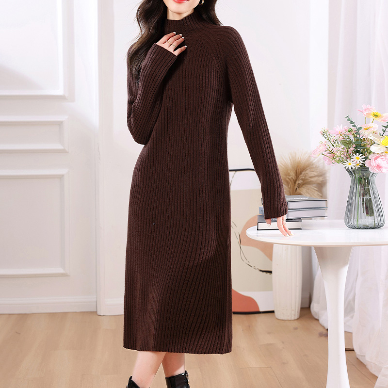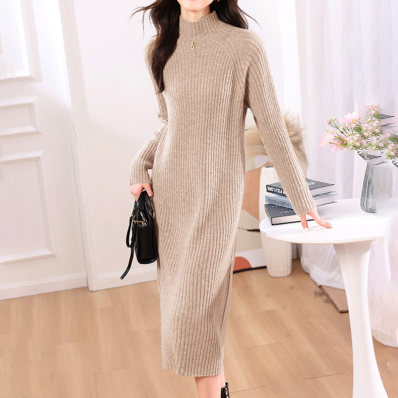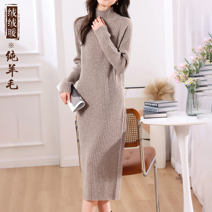 秋冬毛衣裙高领修身针织连衣裙过膝长款打底一步裙100%纯羊毛裙子