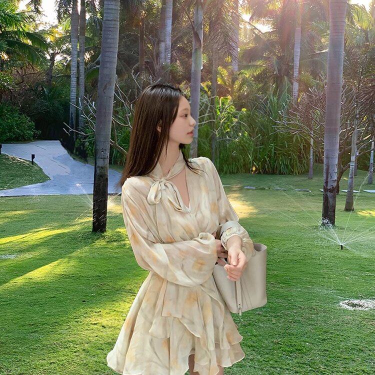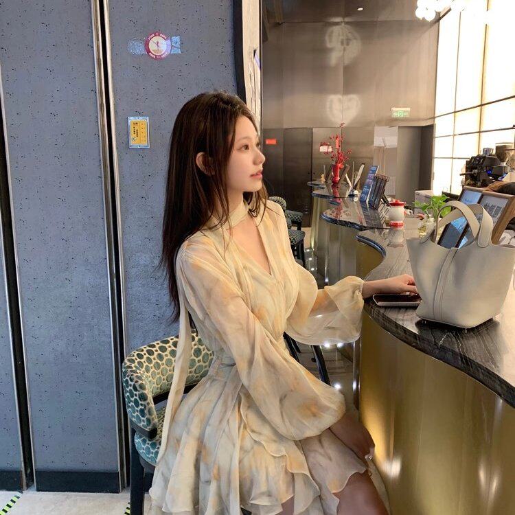 法式碎花v领泡泡袖雪纺连衣裙女2026春季新款收腰不规则飘带短裙
