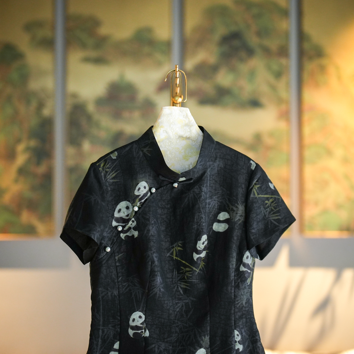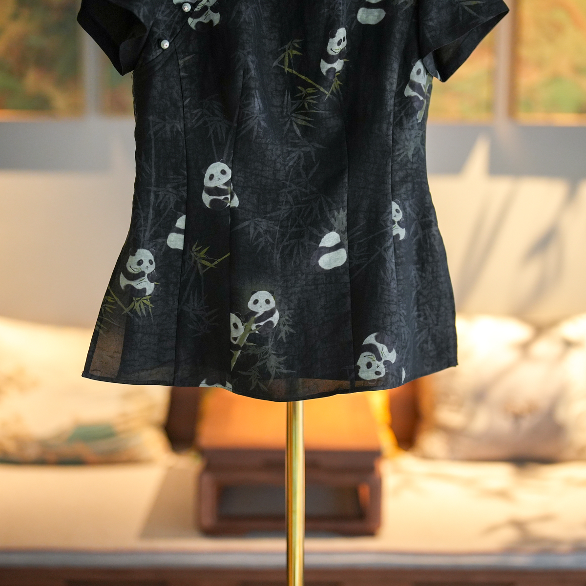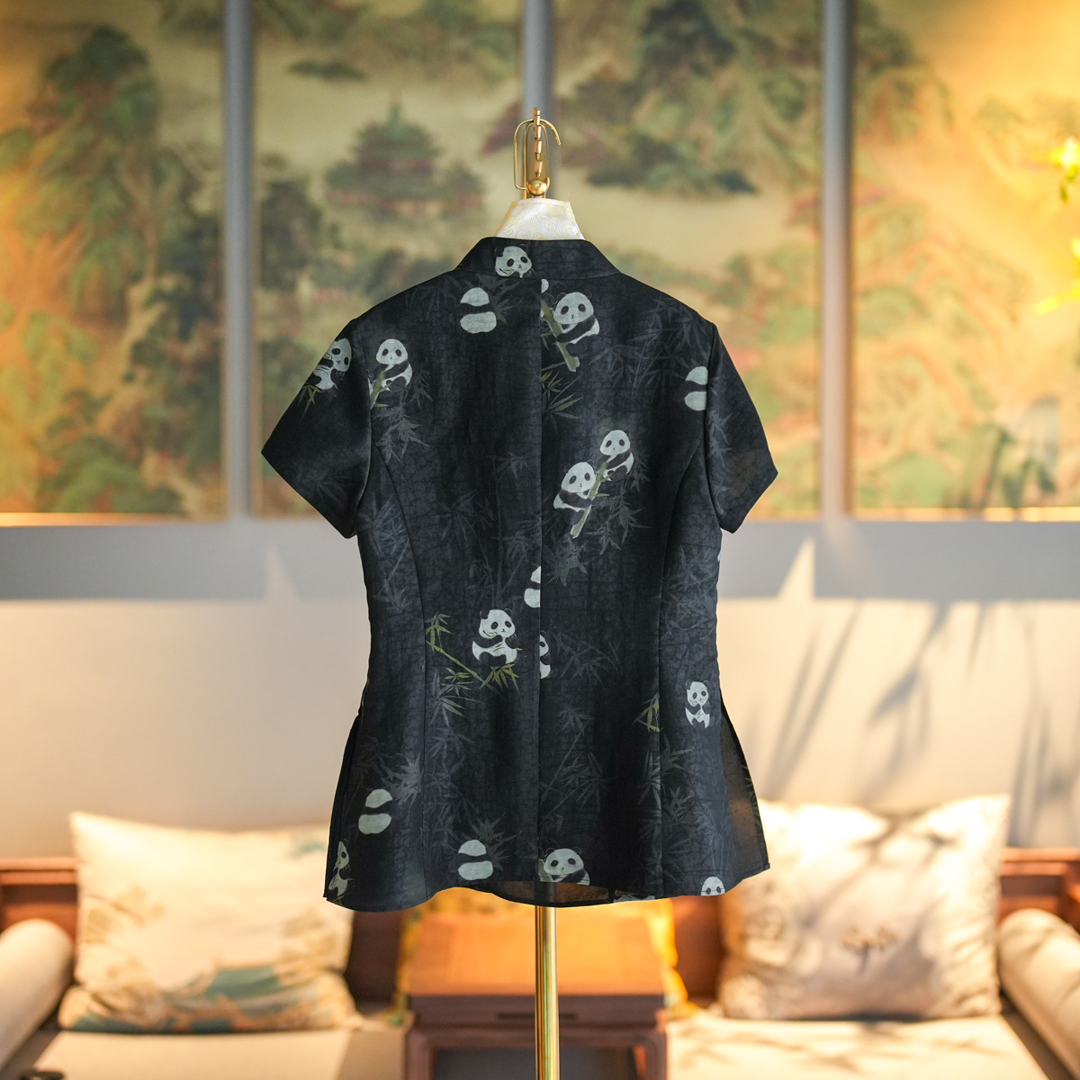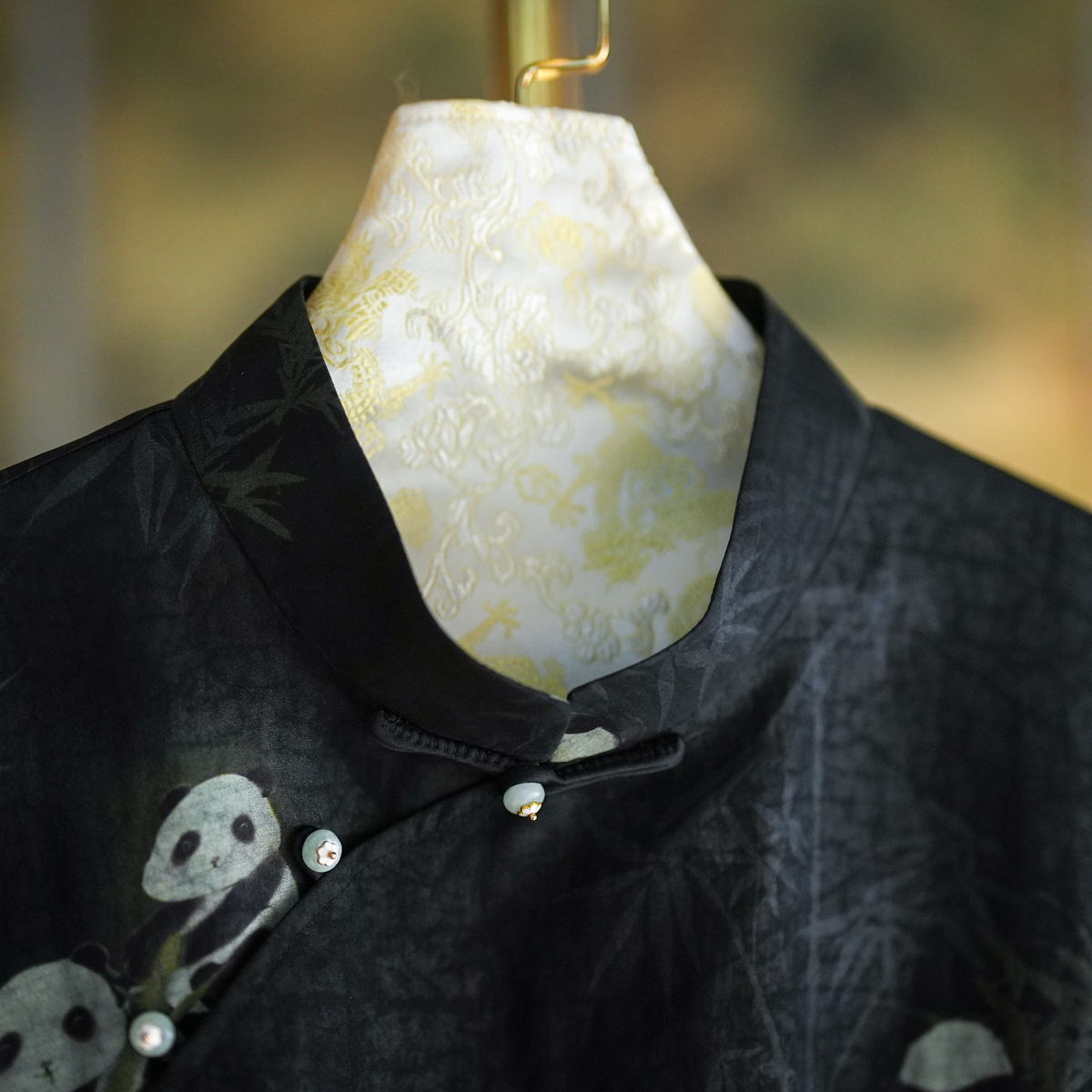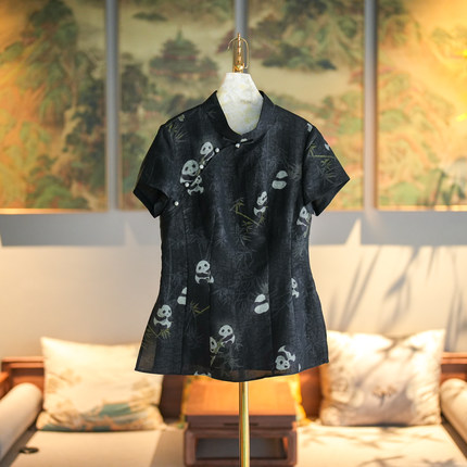 蓝大原创女装中国风熊猫立领盘扣真丝香云纱黑色显瘦上衣7787